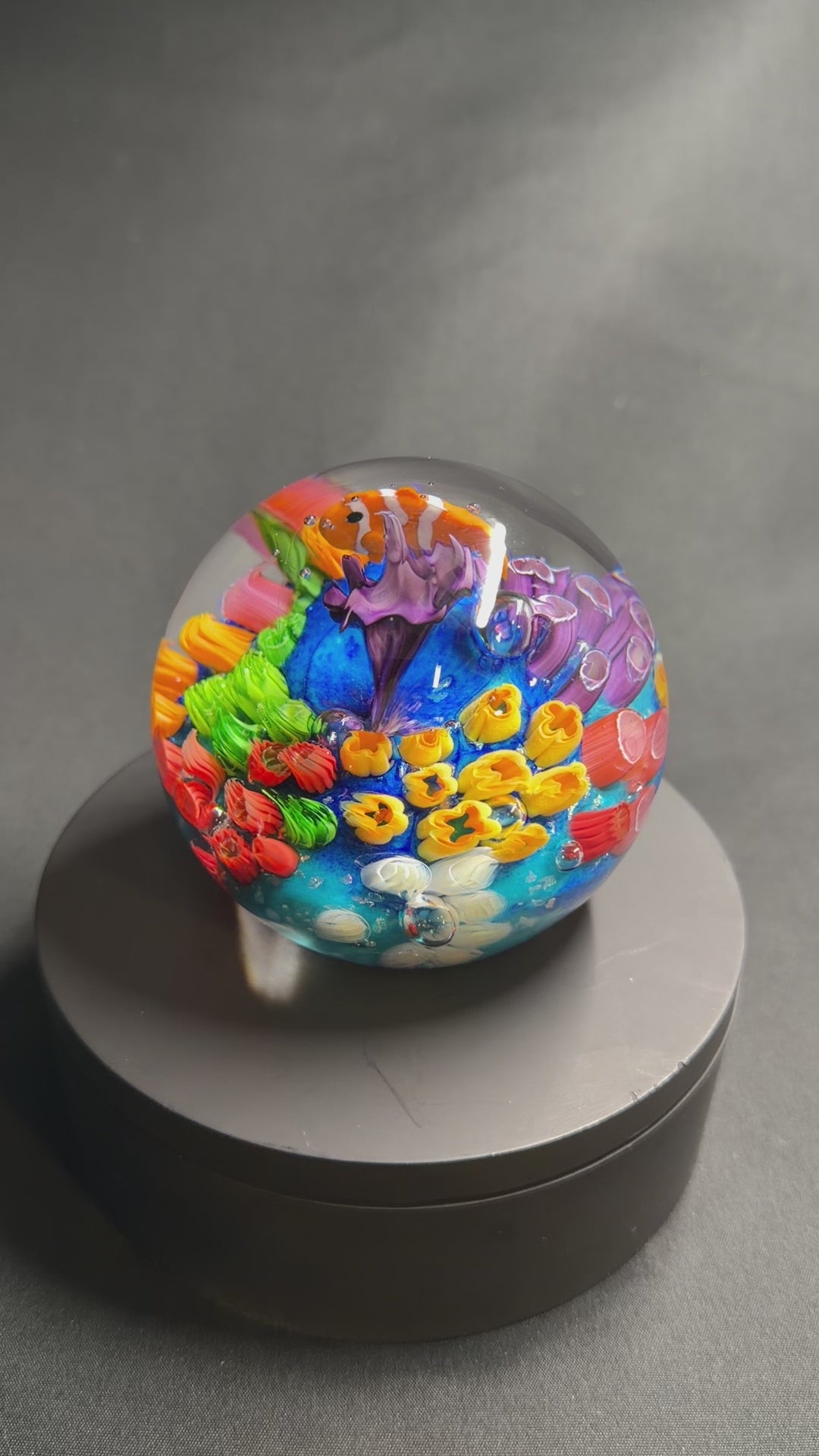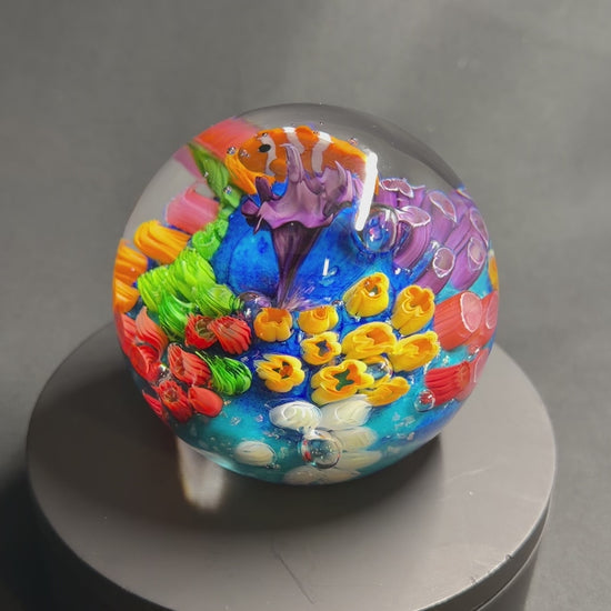 This ocean orb is about around 3.2” in diameter and features a clownfish. This orb is #92 in the ocean orb series. Many of the details glow green/blue under a UV light too.