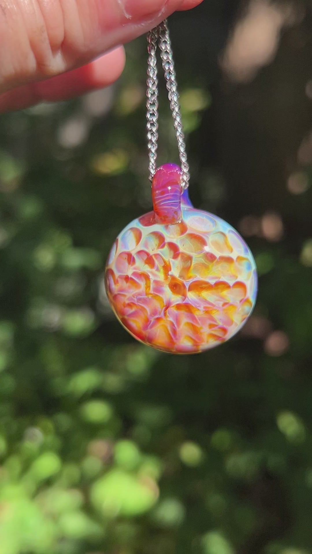 Uses a newer amber purple color that is insanely colorful under bright sunlight. It also glows orange under UV light. Comes on a 20" stainless steel chain. Glows best under 395nm UV light.