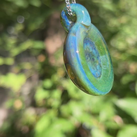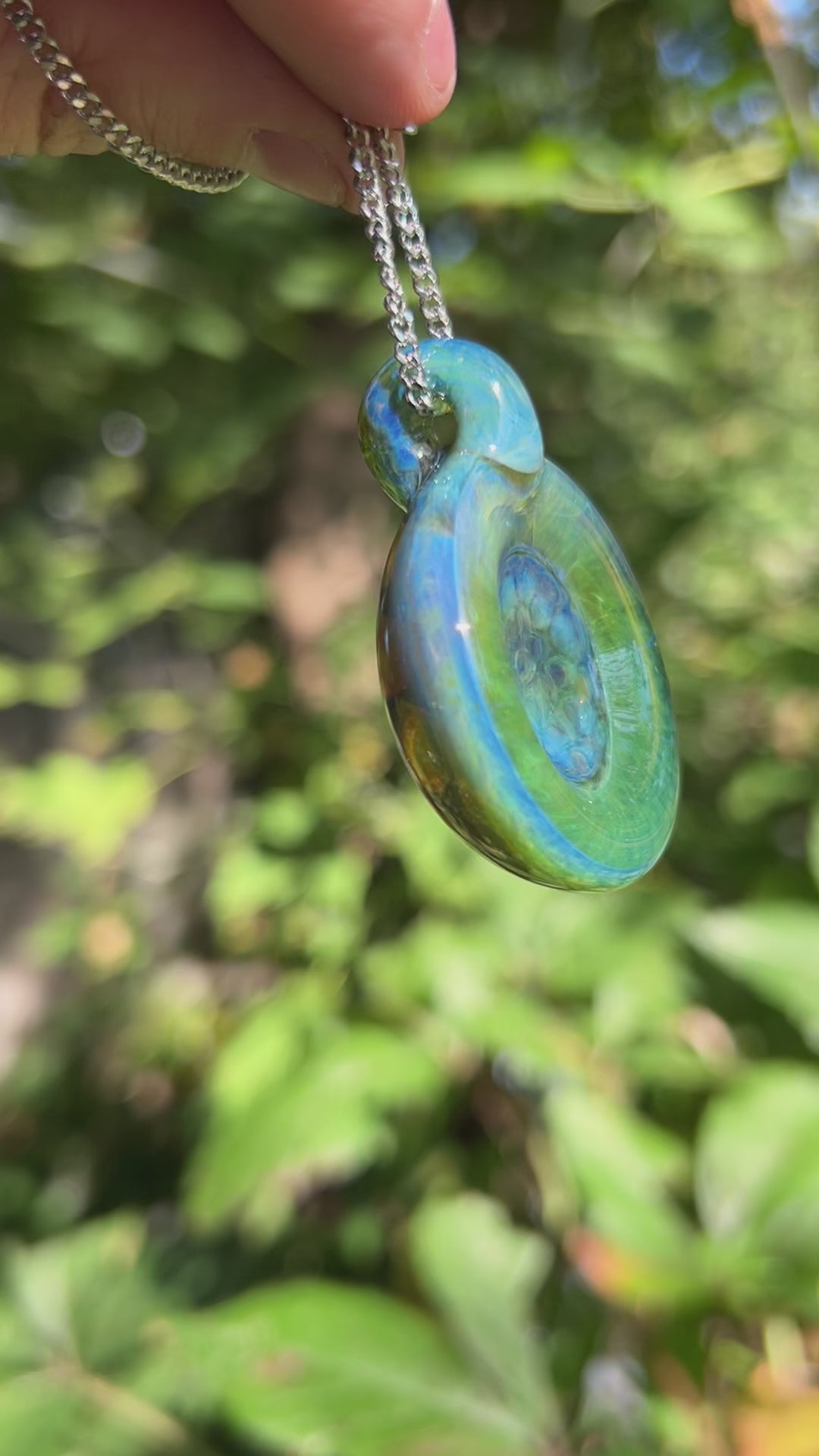 This one uses a bright silver blue color that starts off transparent blue but slowly develops richer blues and greens as you work it. Glows rainbow under UV light too. Glows best under 395nm UV light. Comes on a 20" stainless steel chain.