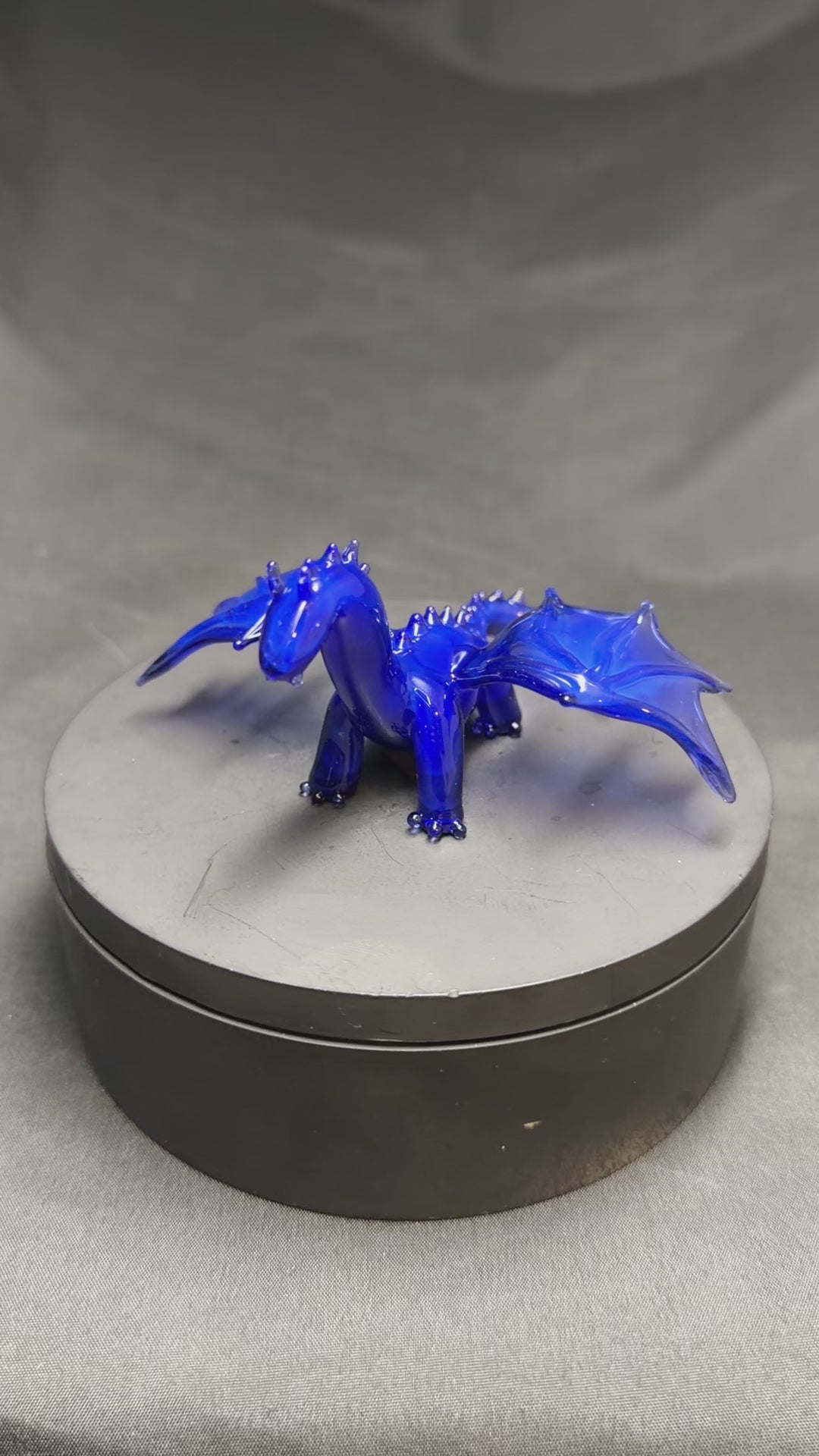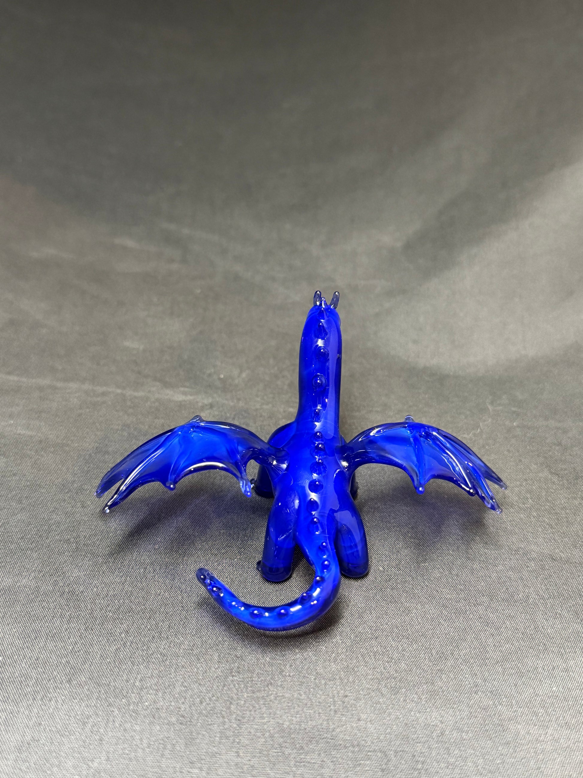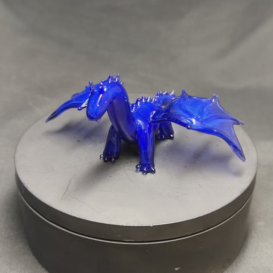 A dragon sculpture made using a vivid blue glass. About 3" long, 4" wide, and 2" tall.