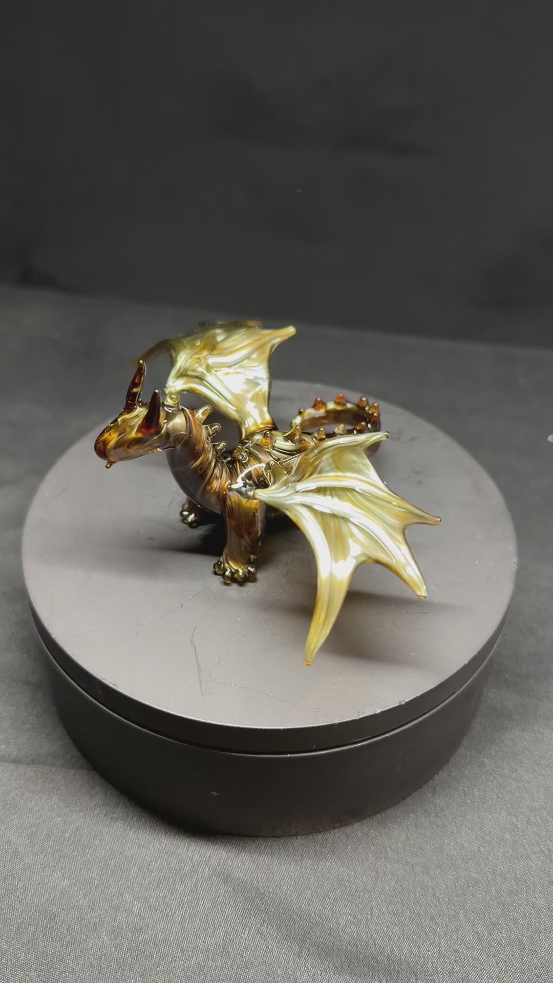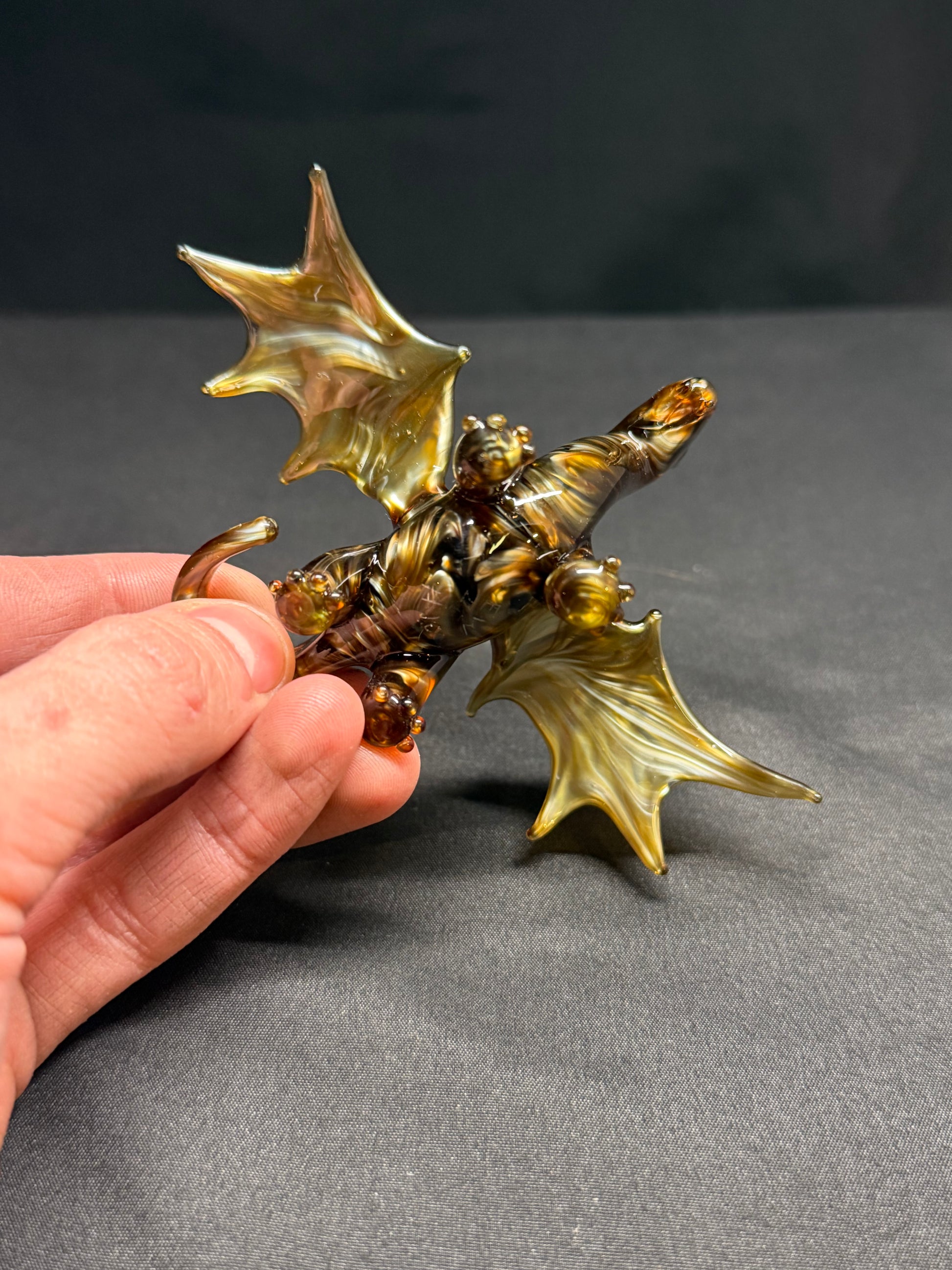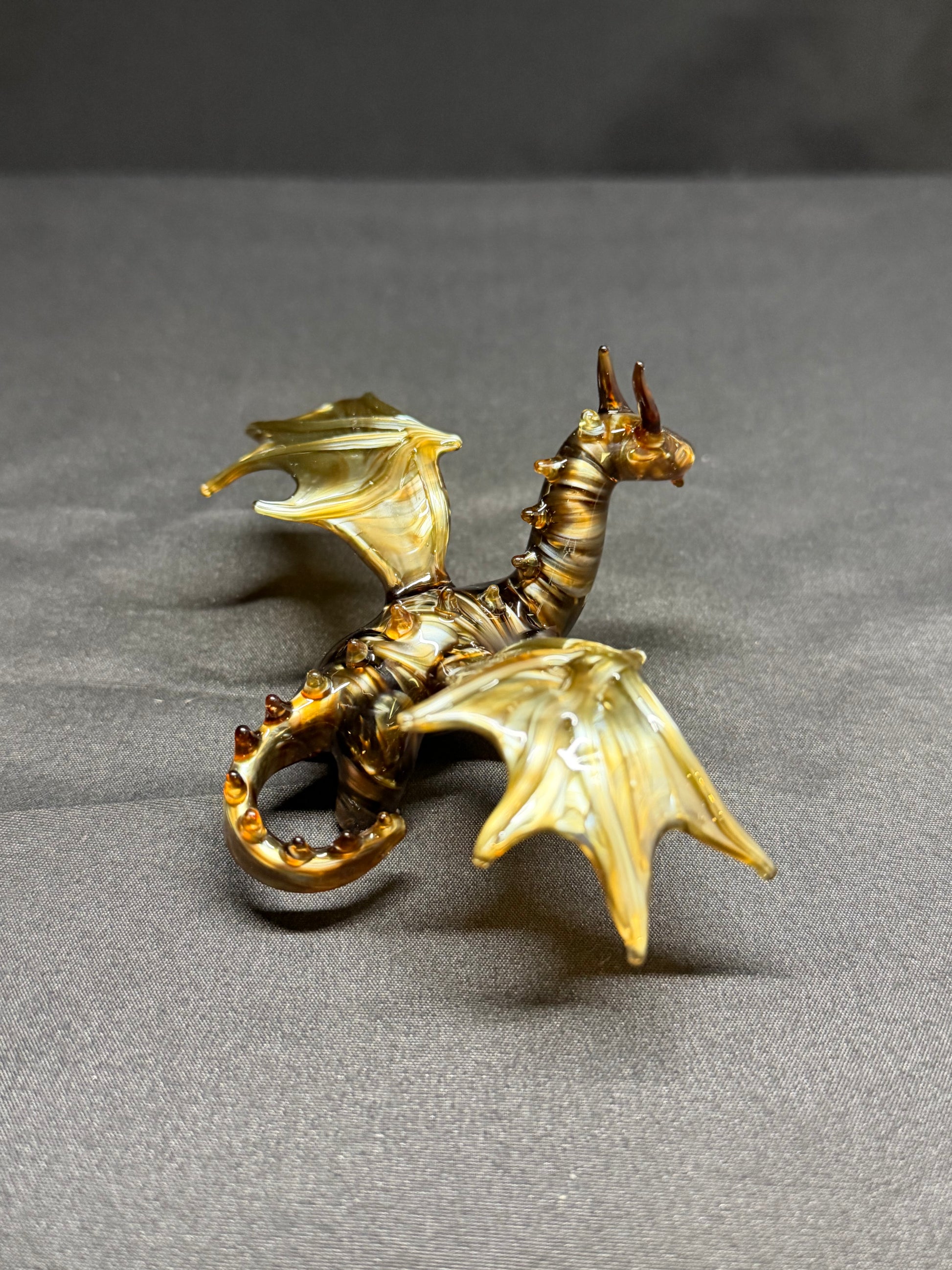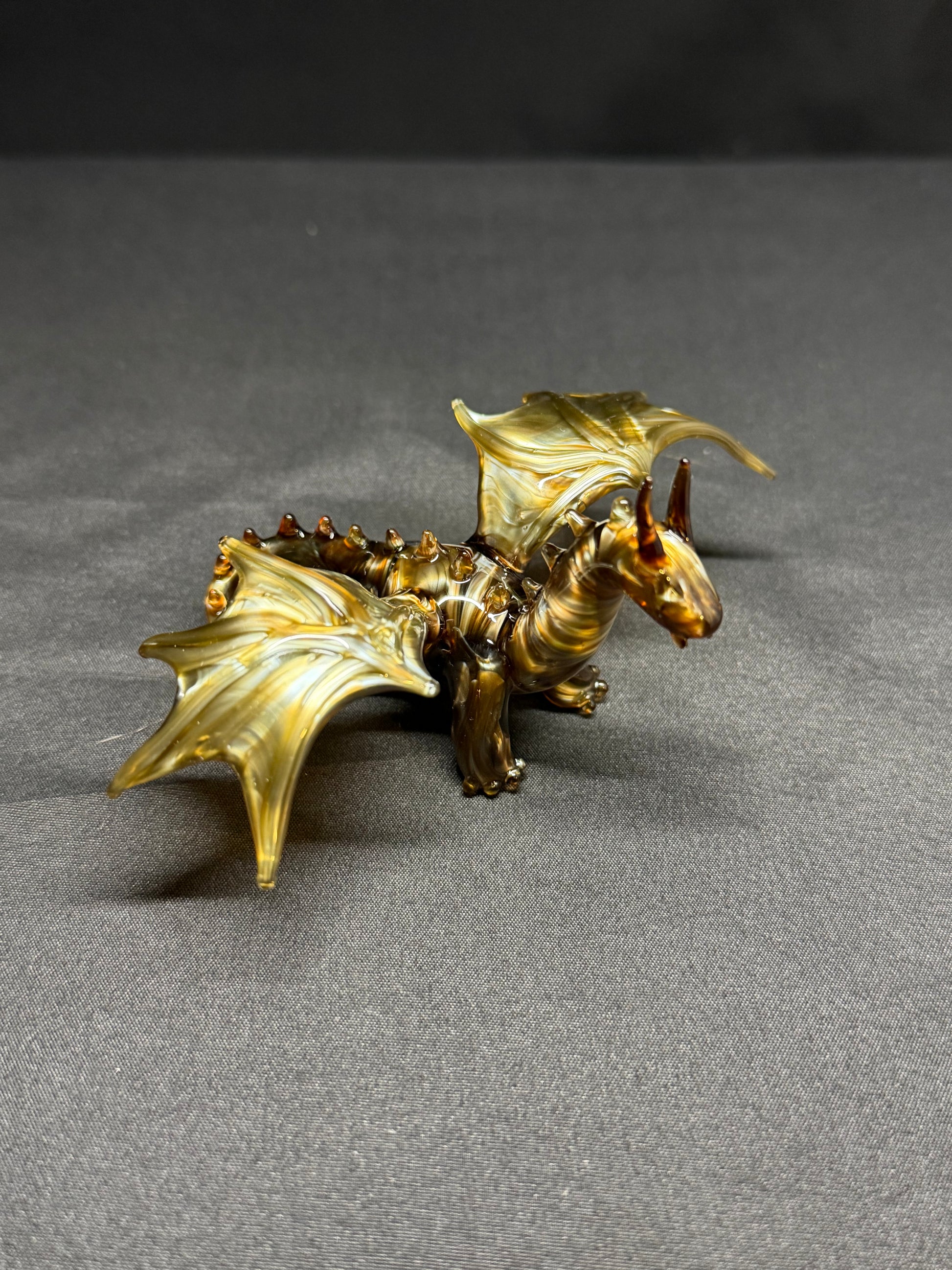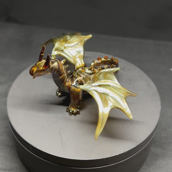 A dragon sculpture made using a metallic looking amber glass. About 3" long, 4" wide, and 2" tall.