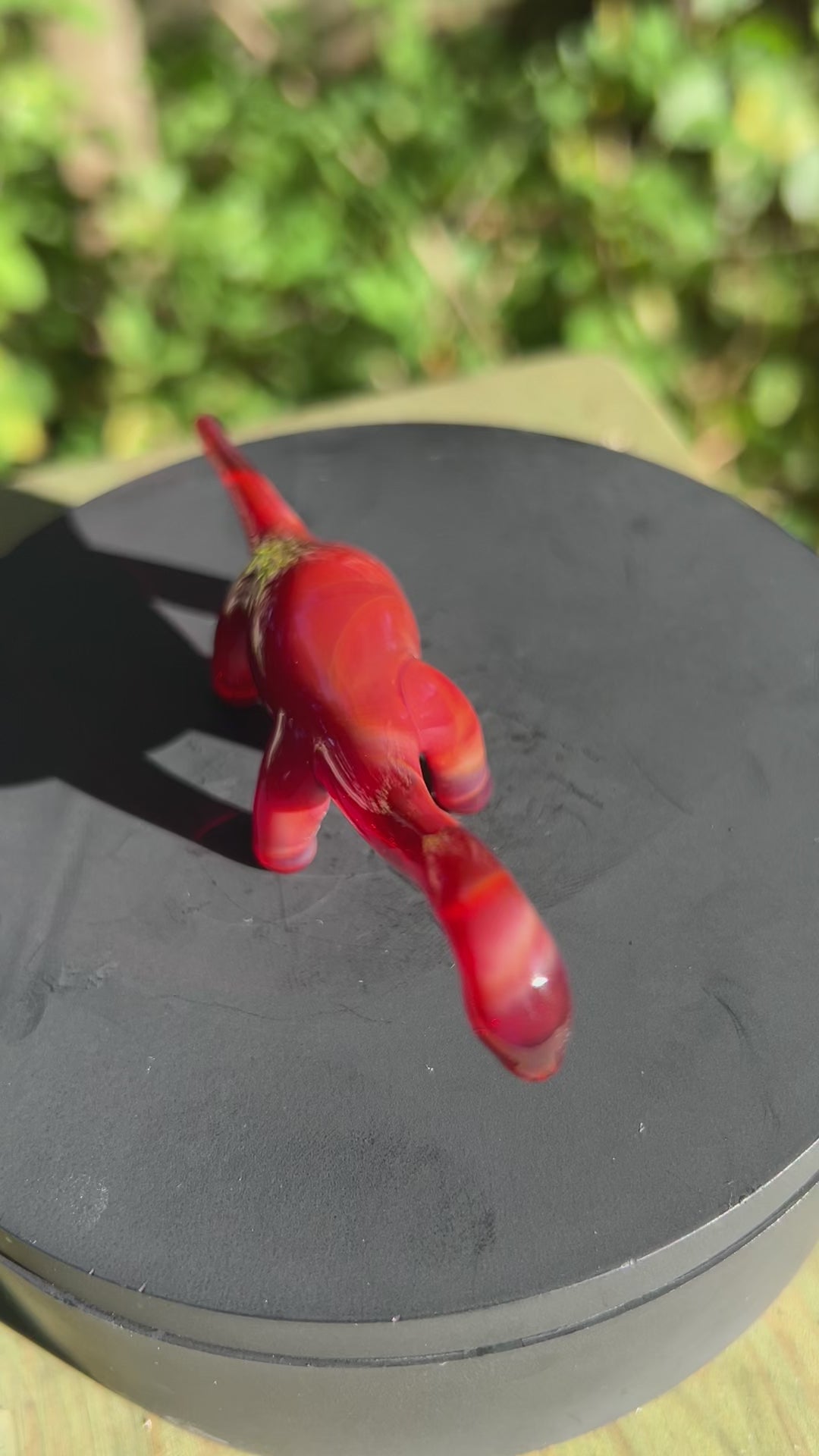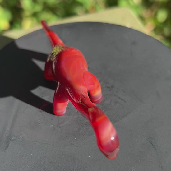 A handmade borosilicate glass dino sculpture. Its about 4 inches long and 2 inches tall.