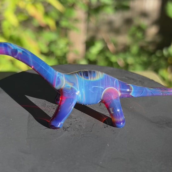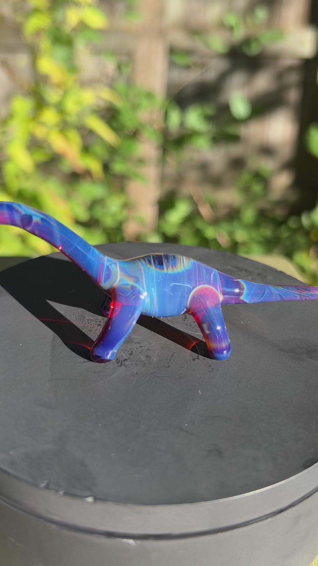 A handmade borosilicate glass dino sculpture. Its about 4 inches long and 2 inches tall.