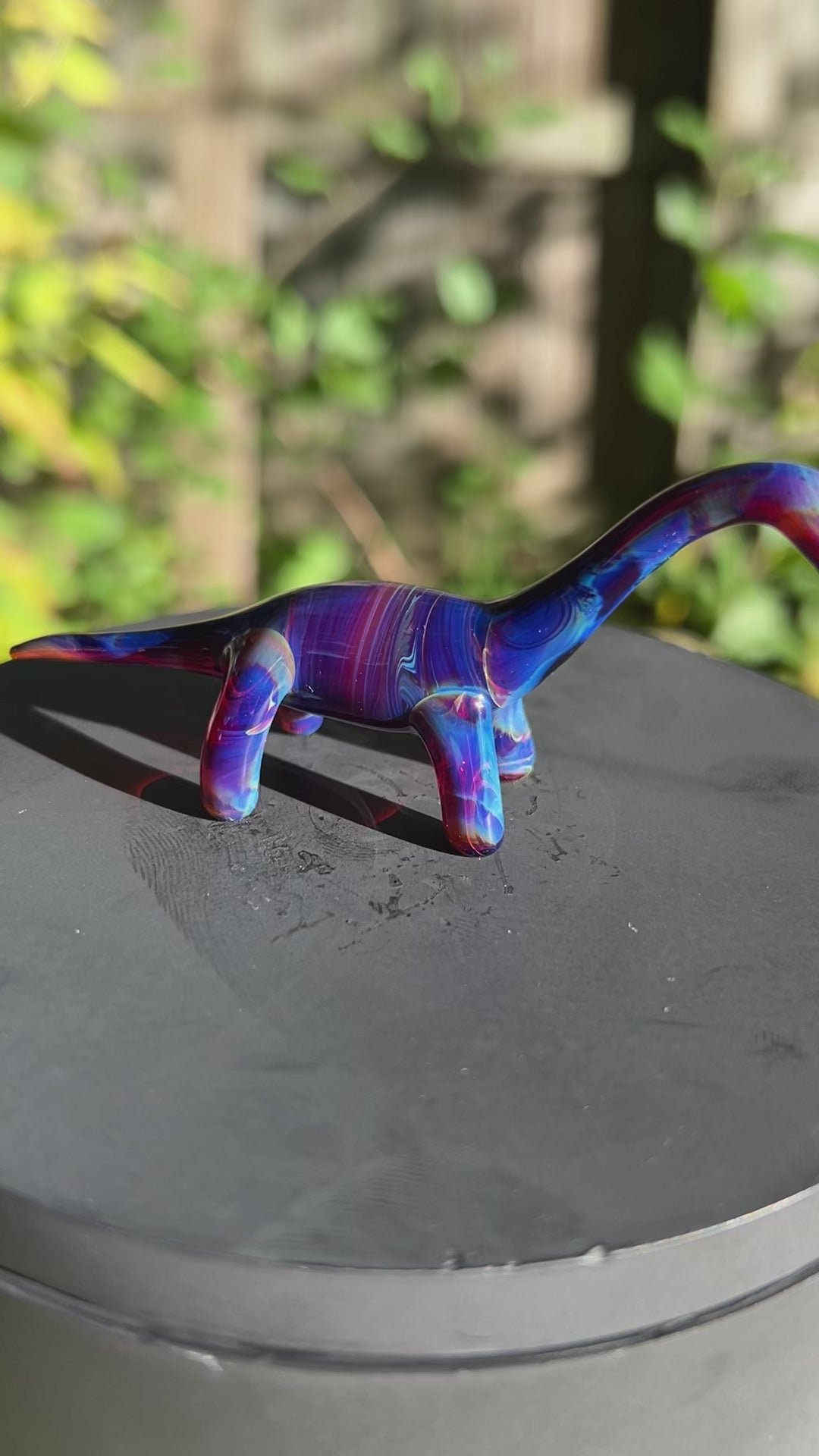 A handmade borosilicate glass dino sculpture. Its about 3.7 inches long and 2 inches tall.
