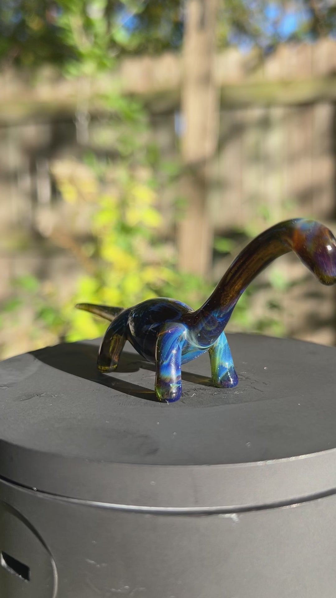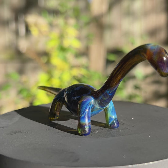 A handmade borosilicate glass dino sculpture. Its about 4.5 inches long and 2 inches tall.