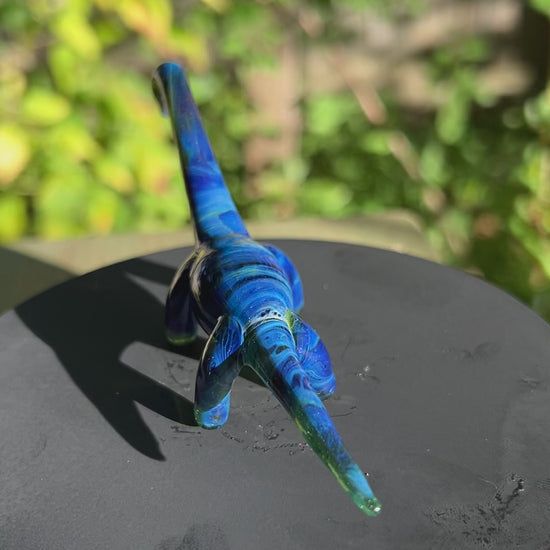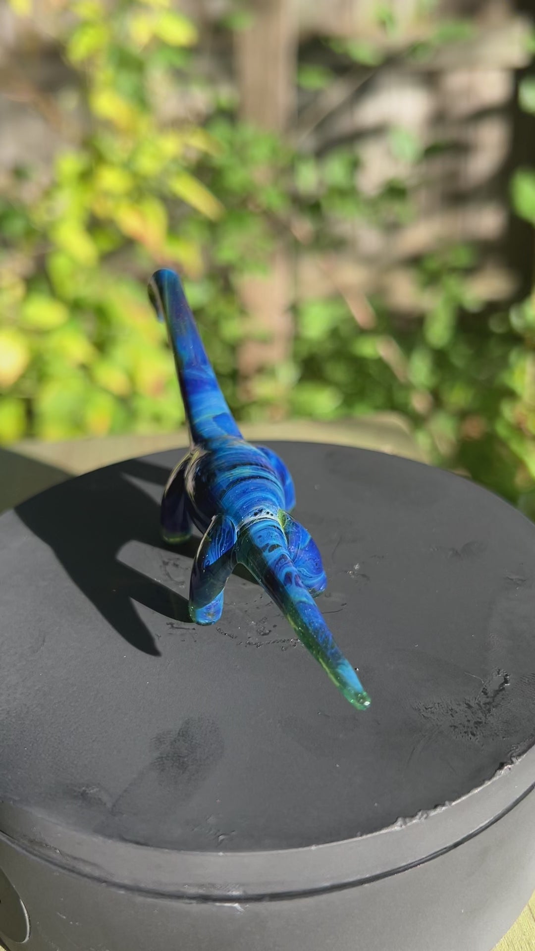 A handmade borosilicate glass dino sculpture. Its about 4.5 inches long and 2 inches tall.