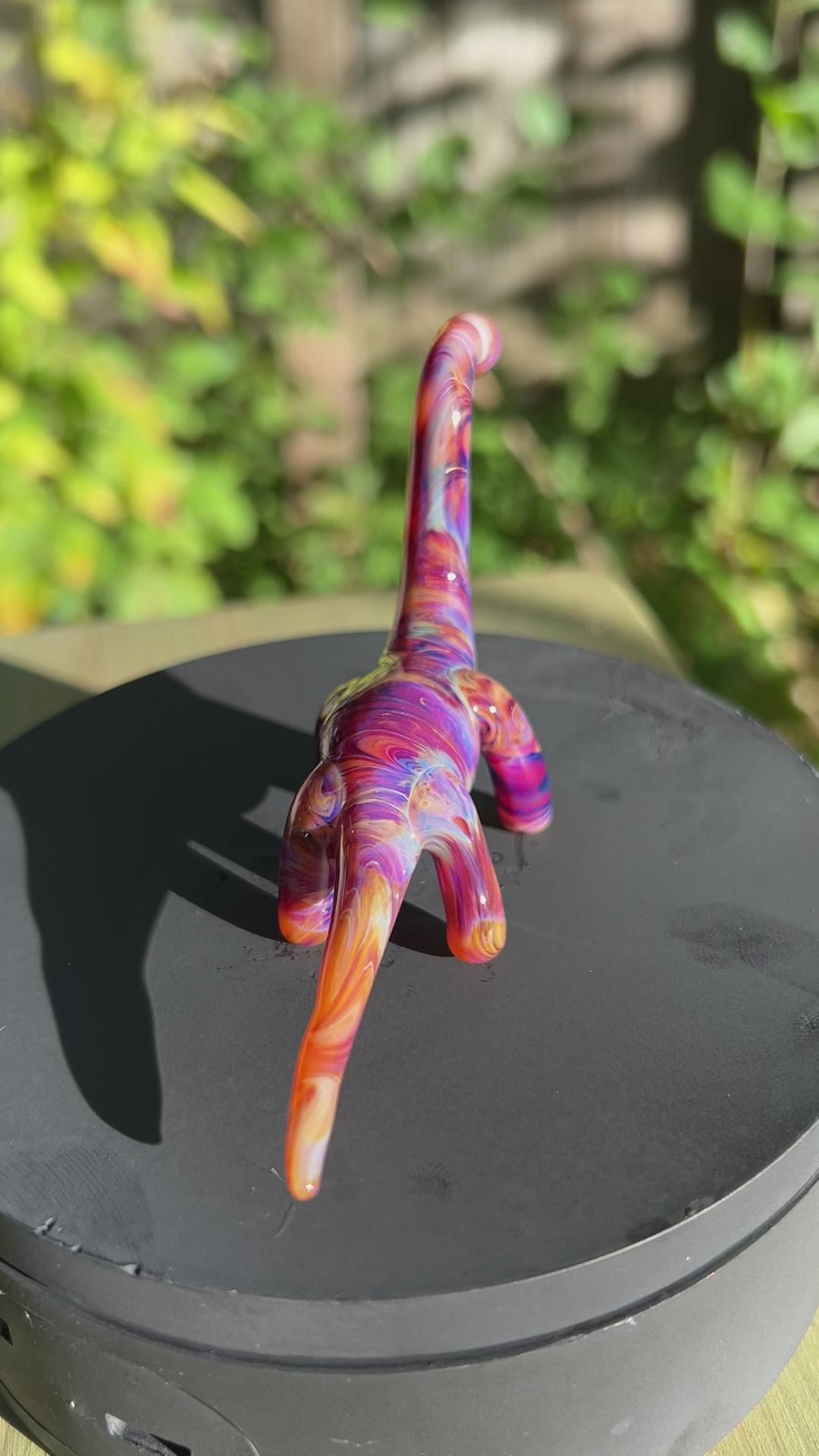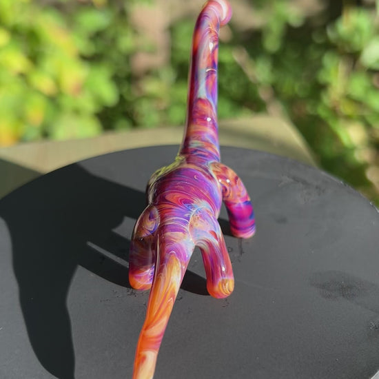 A handmade borosilicate glass dino sculpture. Its about 4.5 inches long and 2 inches tall.