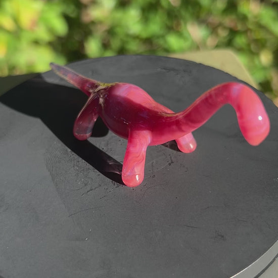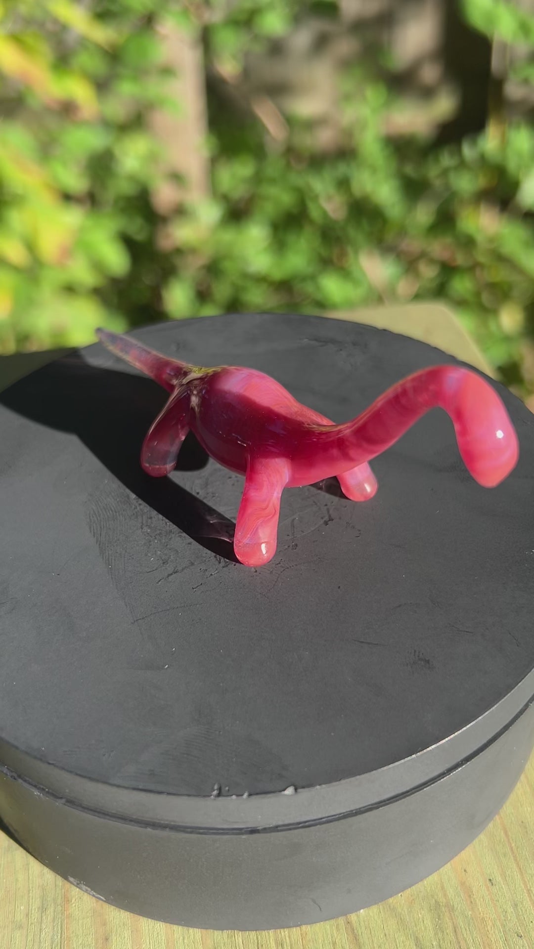 A handmade borosilicate glass dino sculpture. Its about 4 inches long and 2 inches tall.