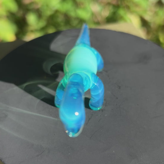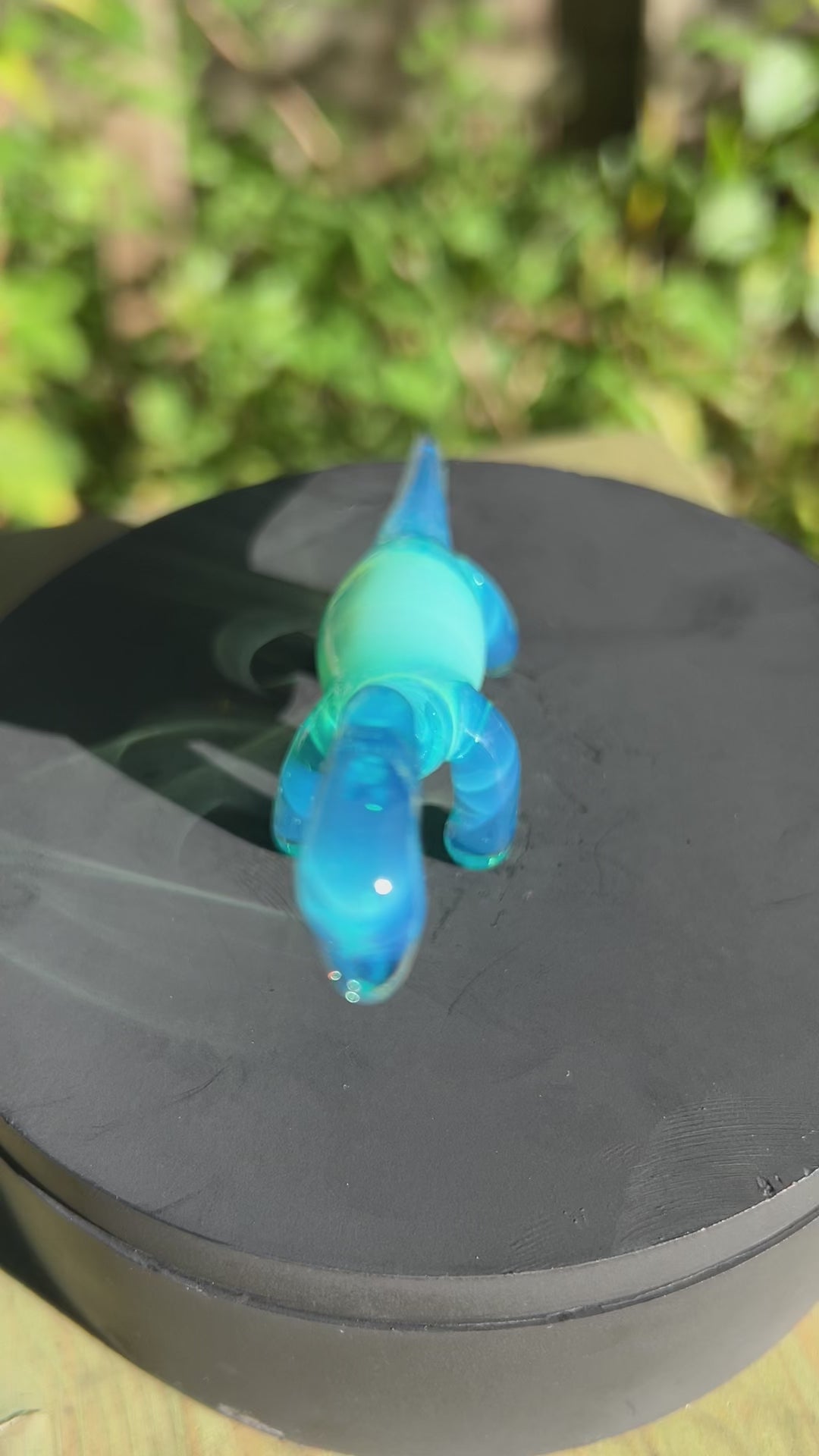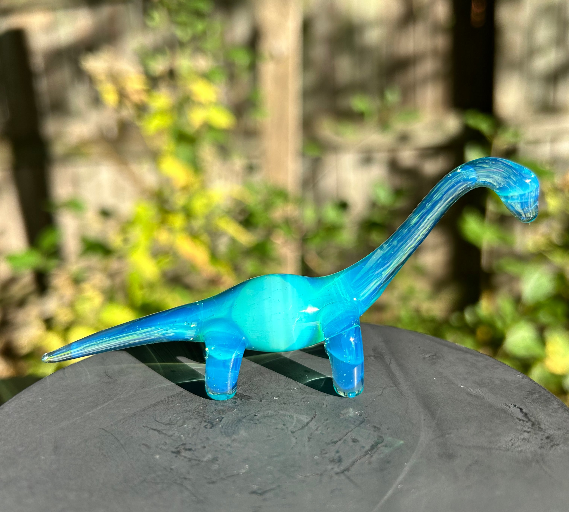 A handmade borosilicate glass dino sculpture. Its about 4 inches long and 2 inches tall.