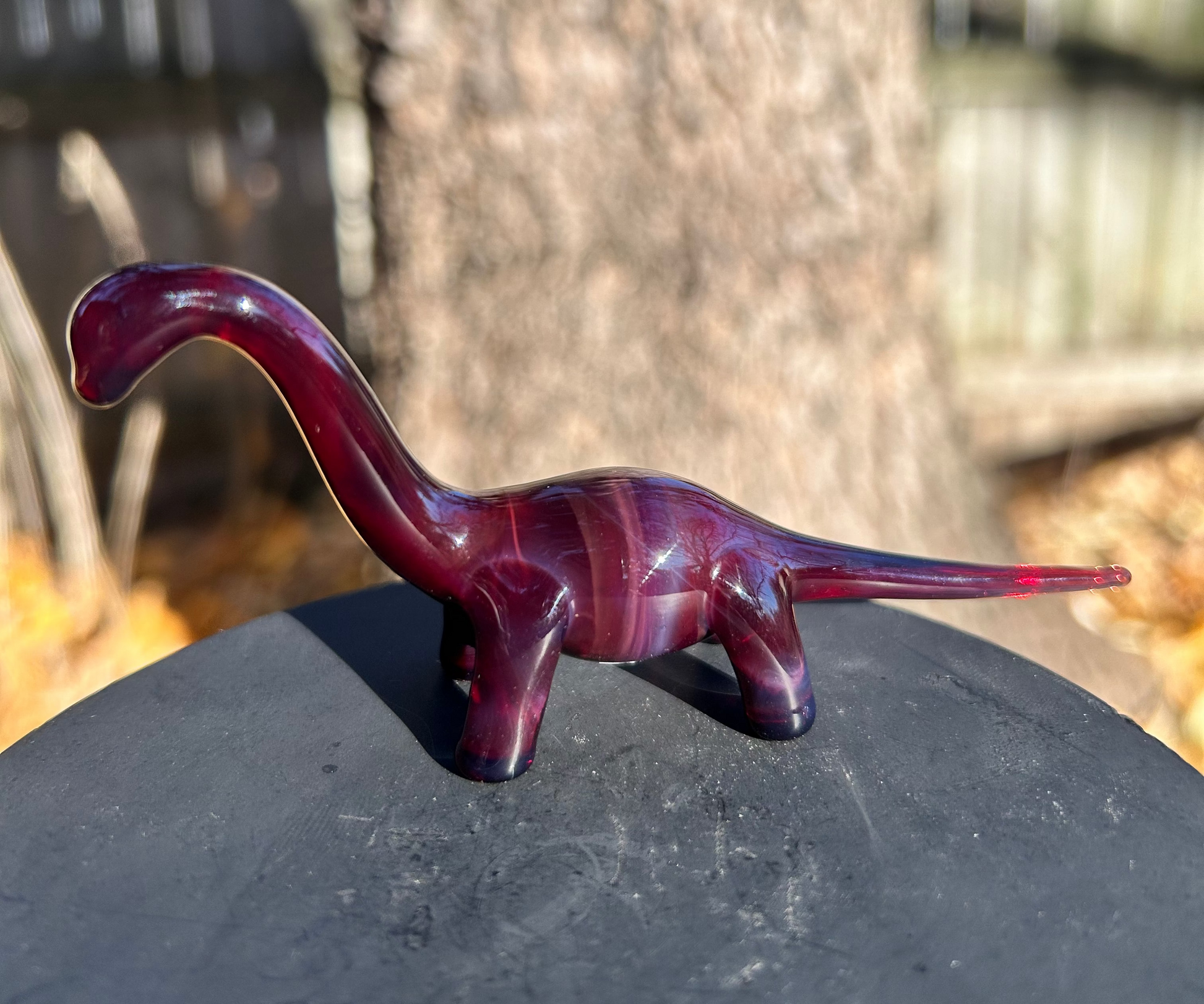 A handmade borosilicate glass dino sculpture. Its about 4 inches long and 2 inches tall.