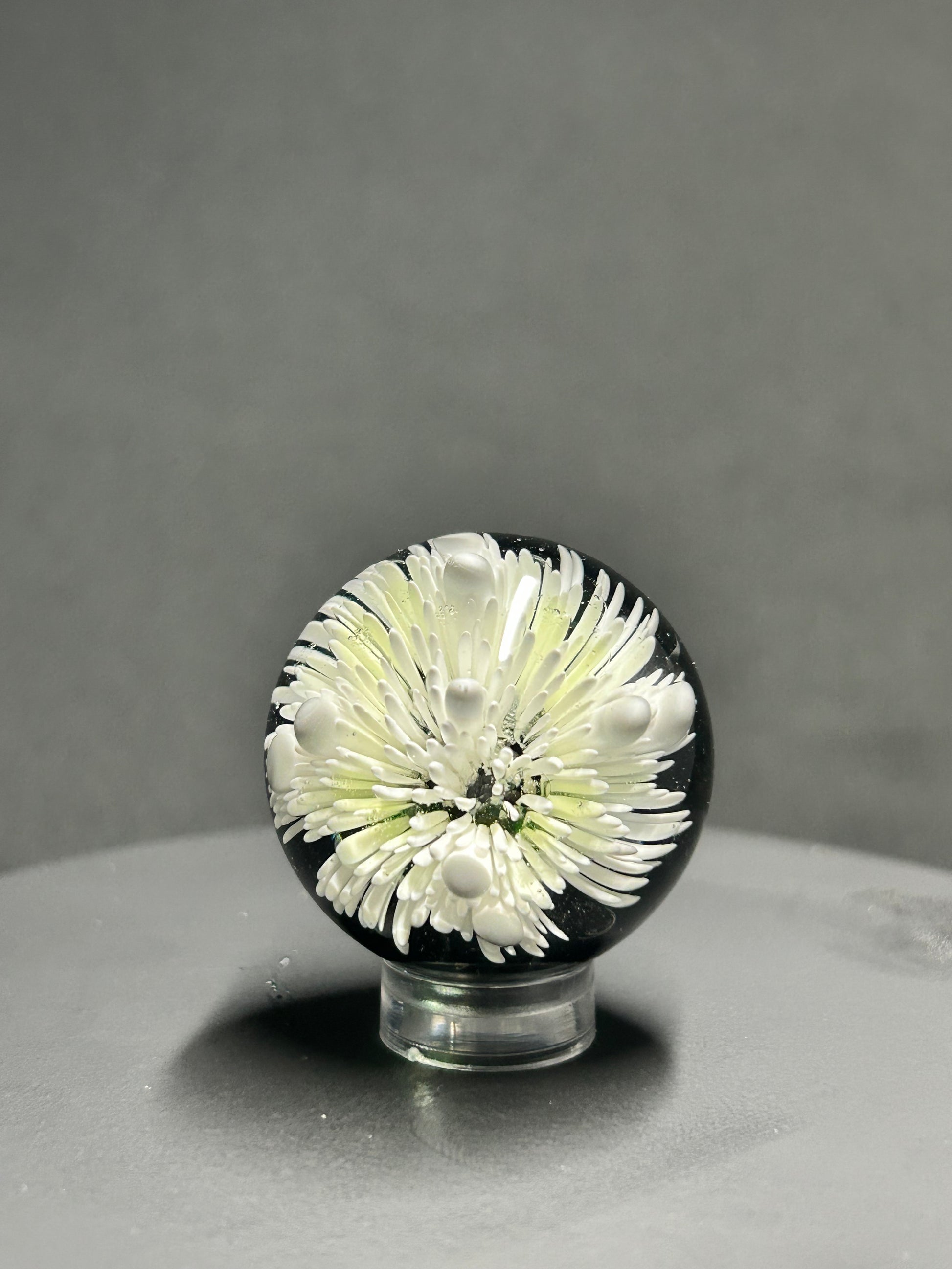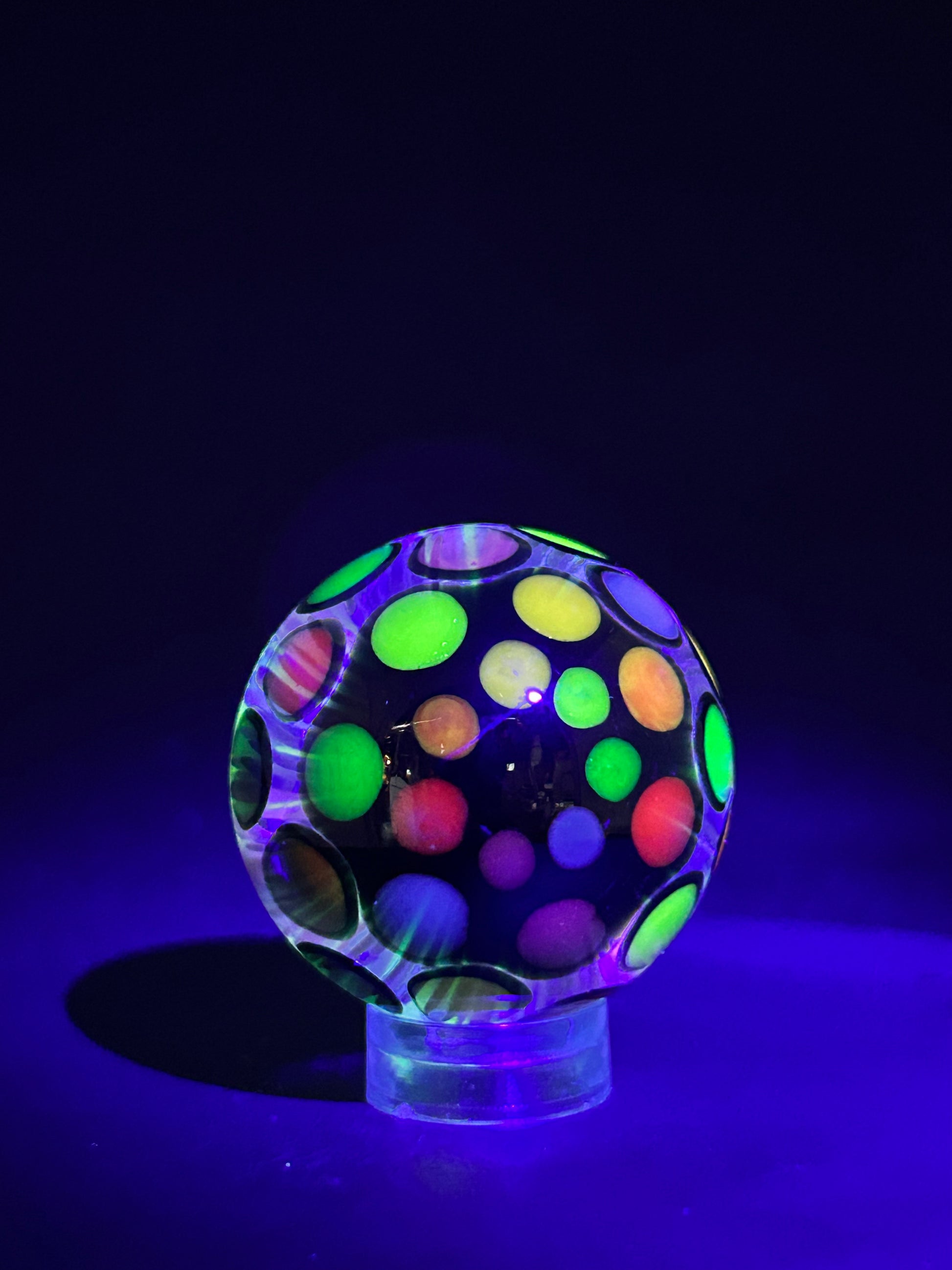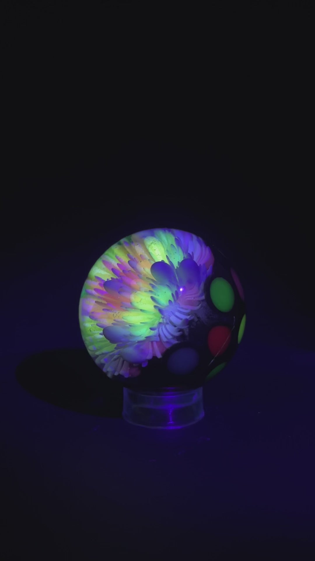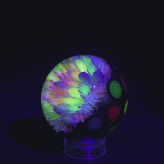 This Full Rainbow UV Implosion Marble features seven UV colors that come alive under UV light. The back reveals intricate dot stacks, adding depth and character to its design. Measuring 33mm, it’s a standout piece for anyone who loves unique, colorful glass art. Comes with an acrylic marble stand.