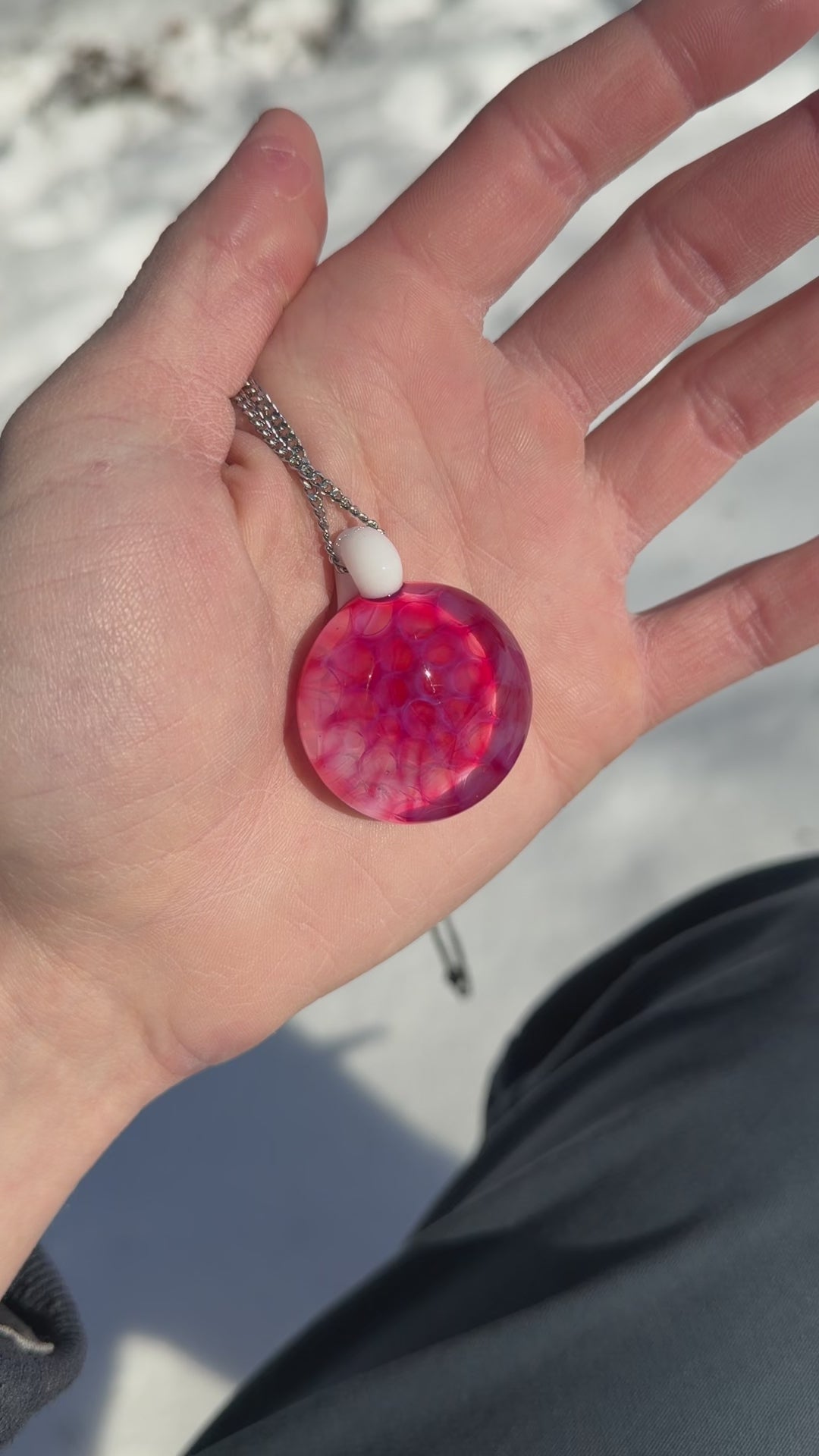 This pendant has a white back with a pink honeycomb design.