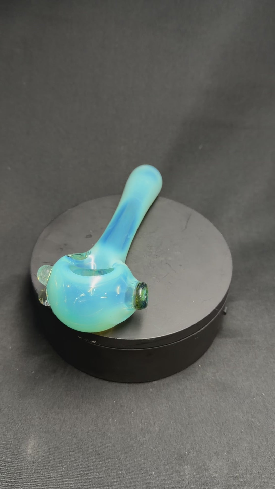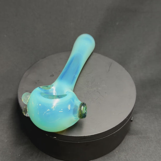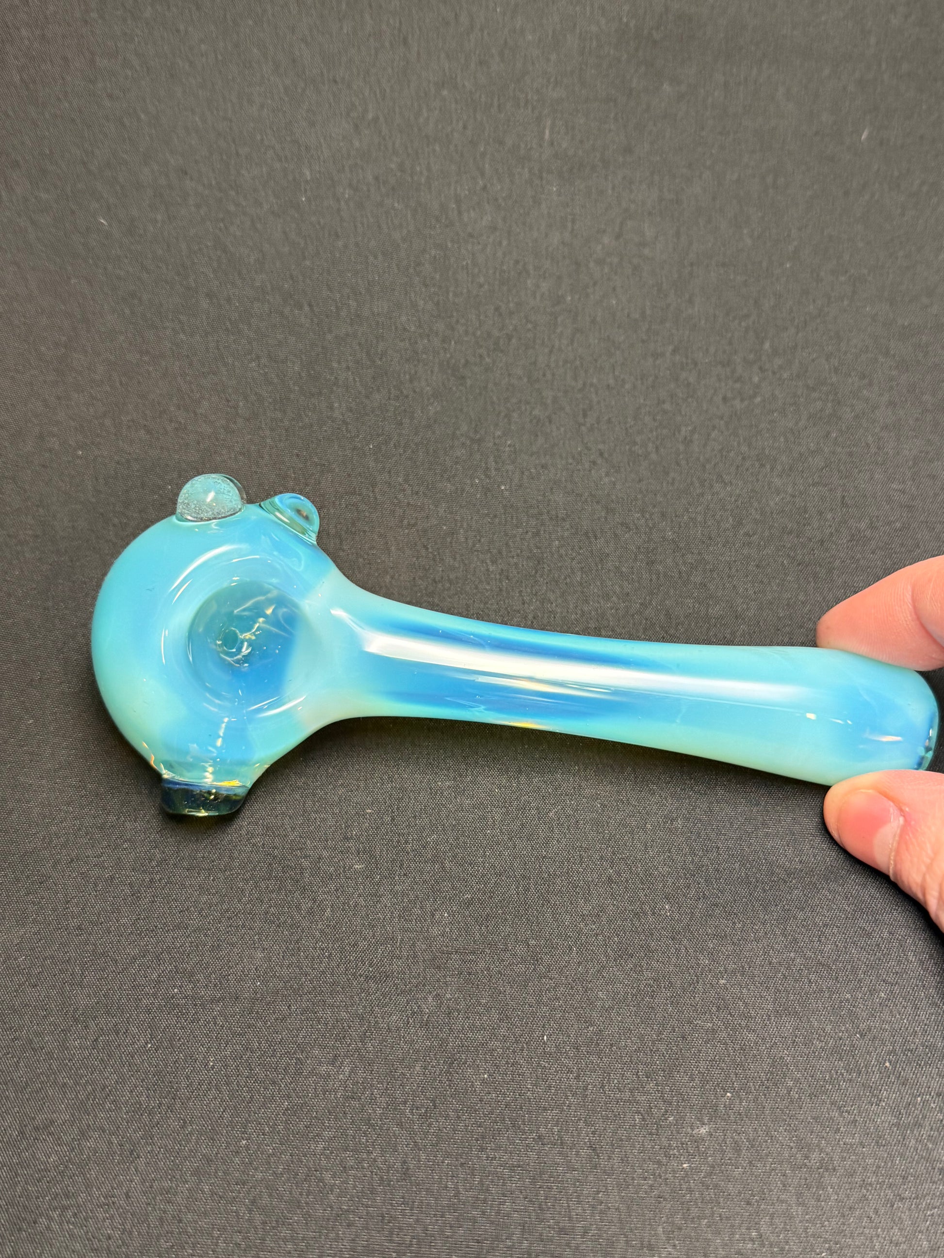 Made using Greasy Glass's Marina sleeved in clear. I imagine this pipe will look very nice once filled in due to the subtle opal blue tones. A bit over 5" long and has a nice weighty feel to it.