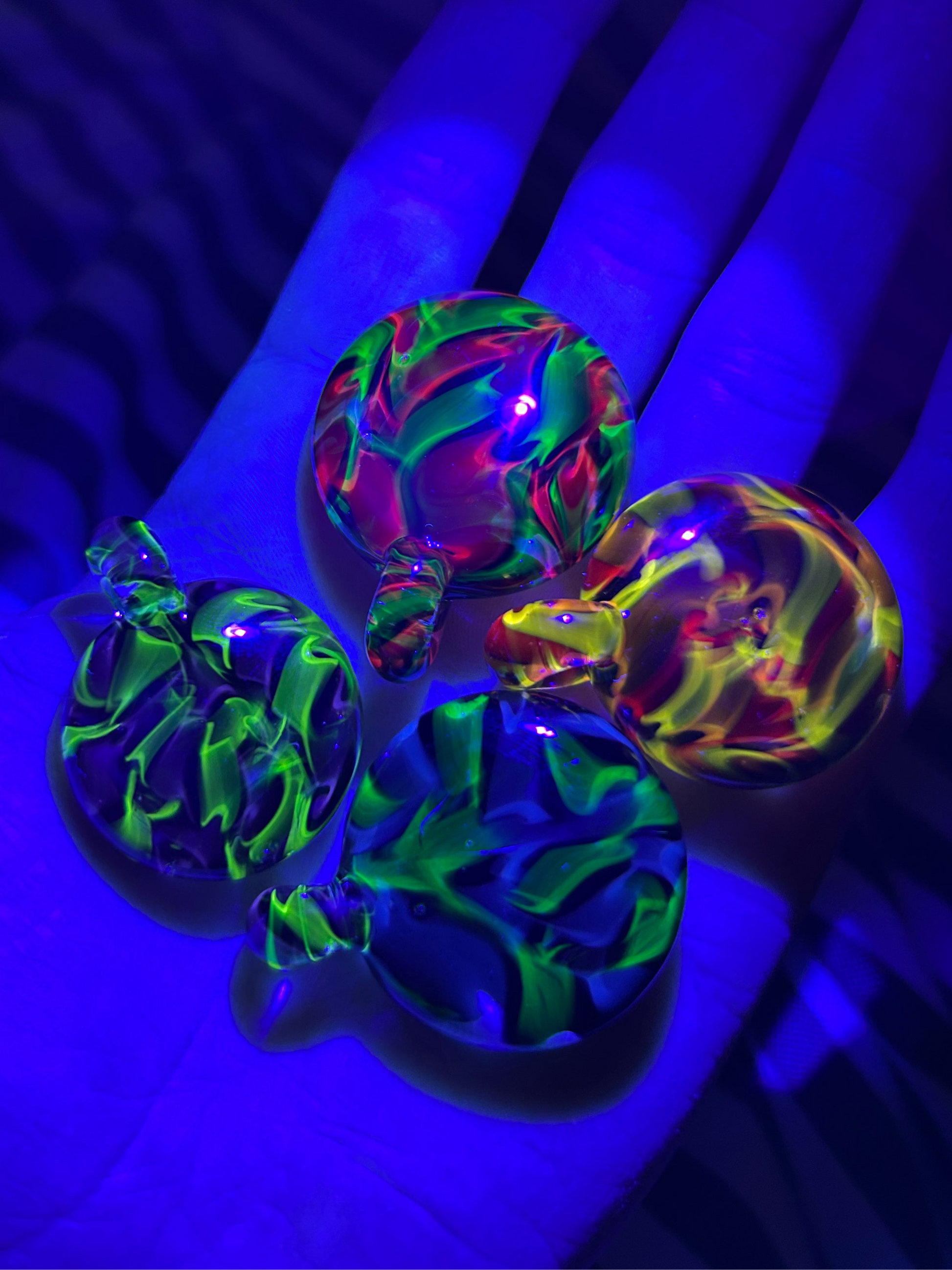 These Multi Color Cane UV Pendants fluoresce with 2-3 vibrant UV colors, created by artistically collapsing a custom cane onto itself. Each pendant holds a miniature explosion of color that glows beautifully under UV light. Each Pendant comes with a 20" stainless steel chain.