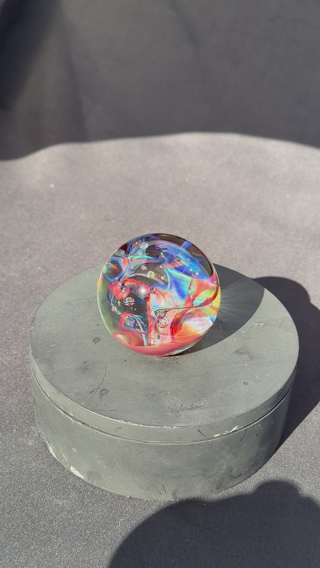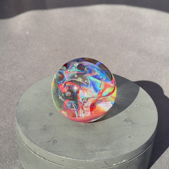 A very colorful and vibrant glass paperweight measuring at about 2.1" in diameter. The pattern within is created by blowing out a very thin bubble of color then letting heat and surface tension collapse it down back into a solid mass.