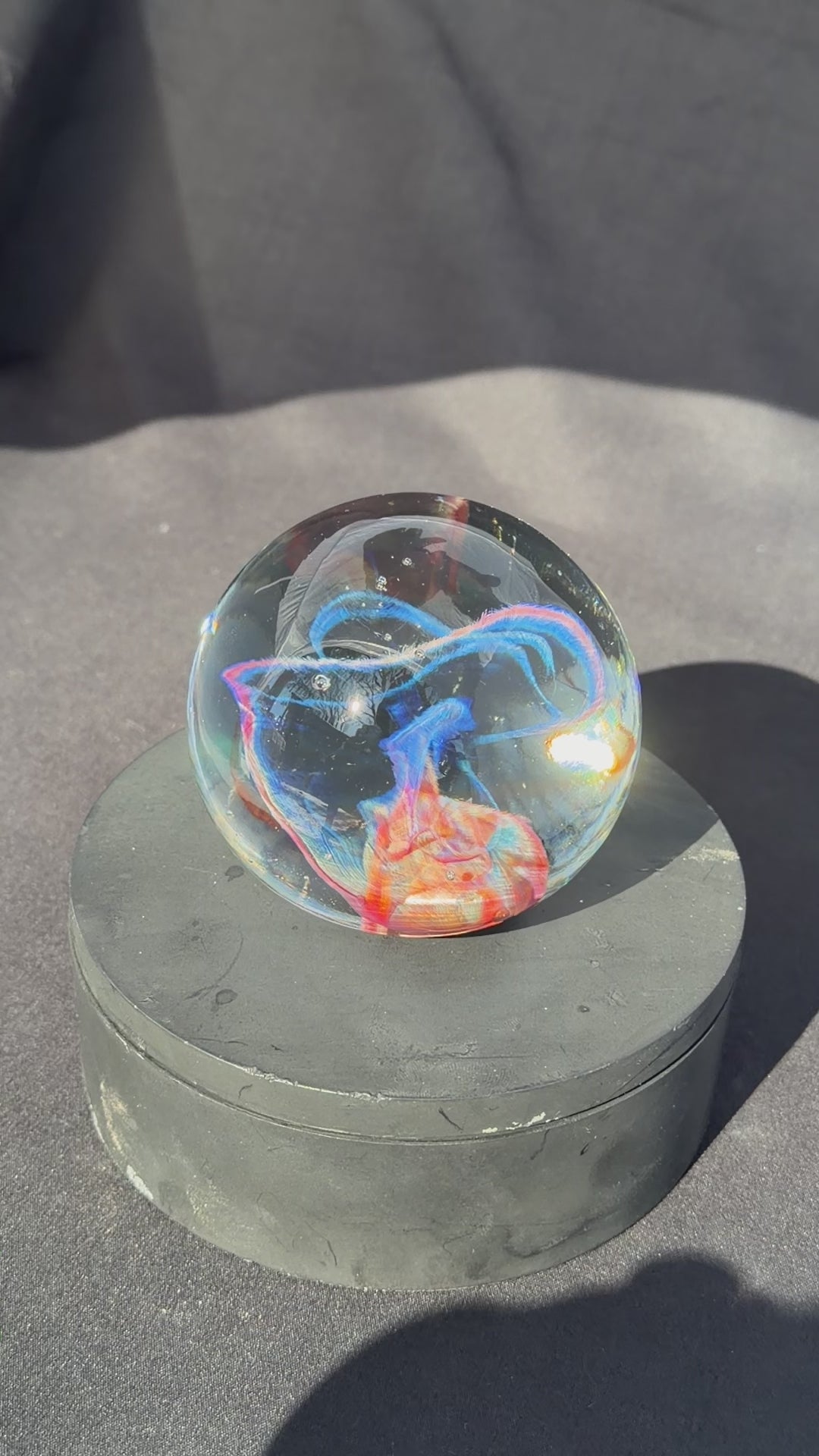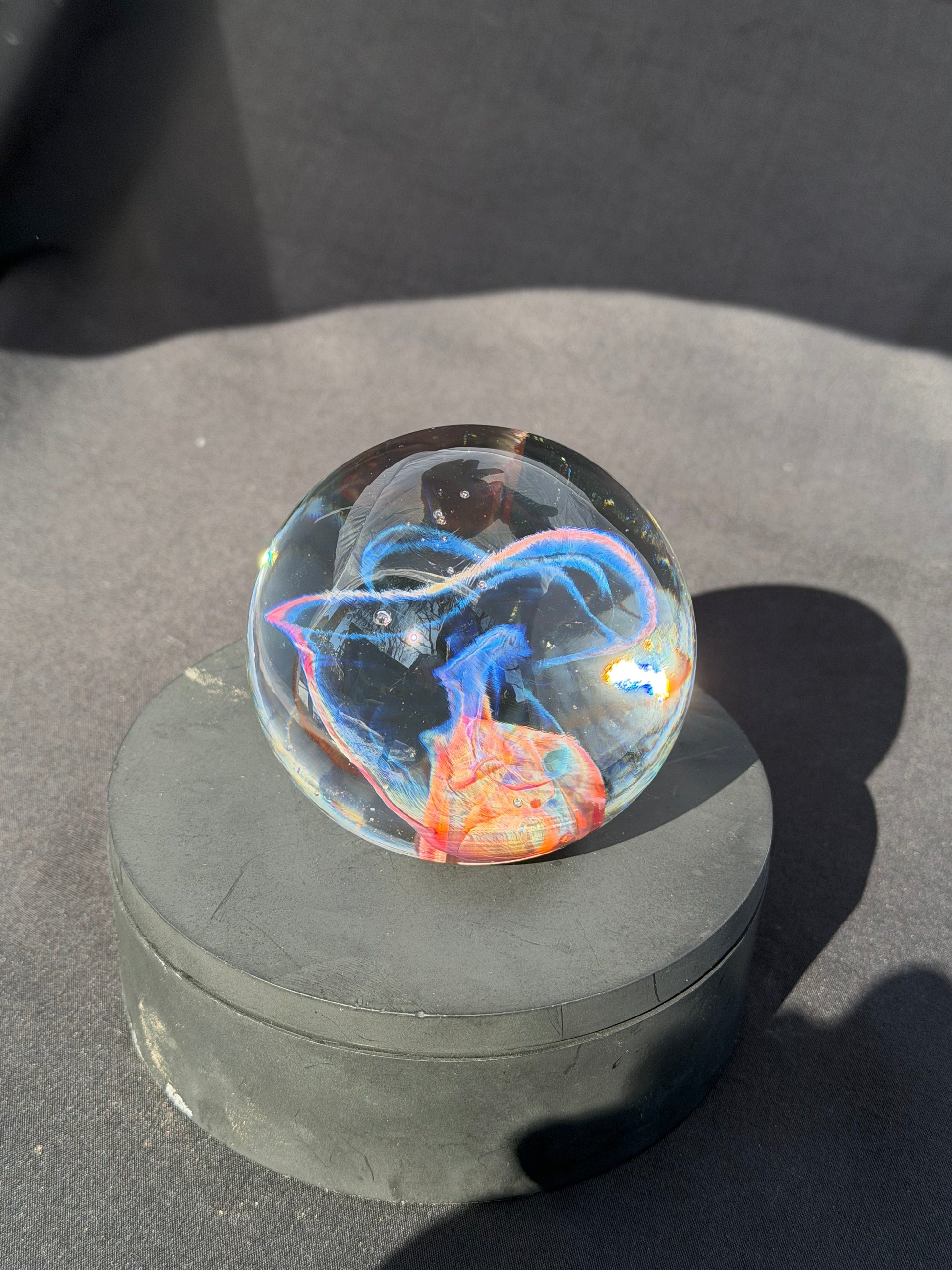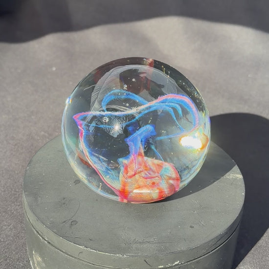 A very colorful and vibrant glass paperweight measuring at about 3" in diameter. The pattern within is created by blowing out a very thin bubble of color then letting heat and surface tension collapse it down back into a solid mass.