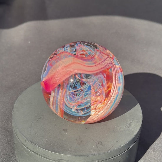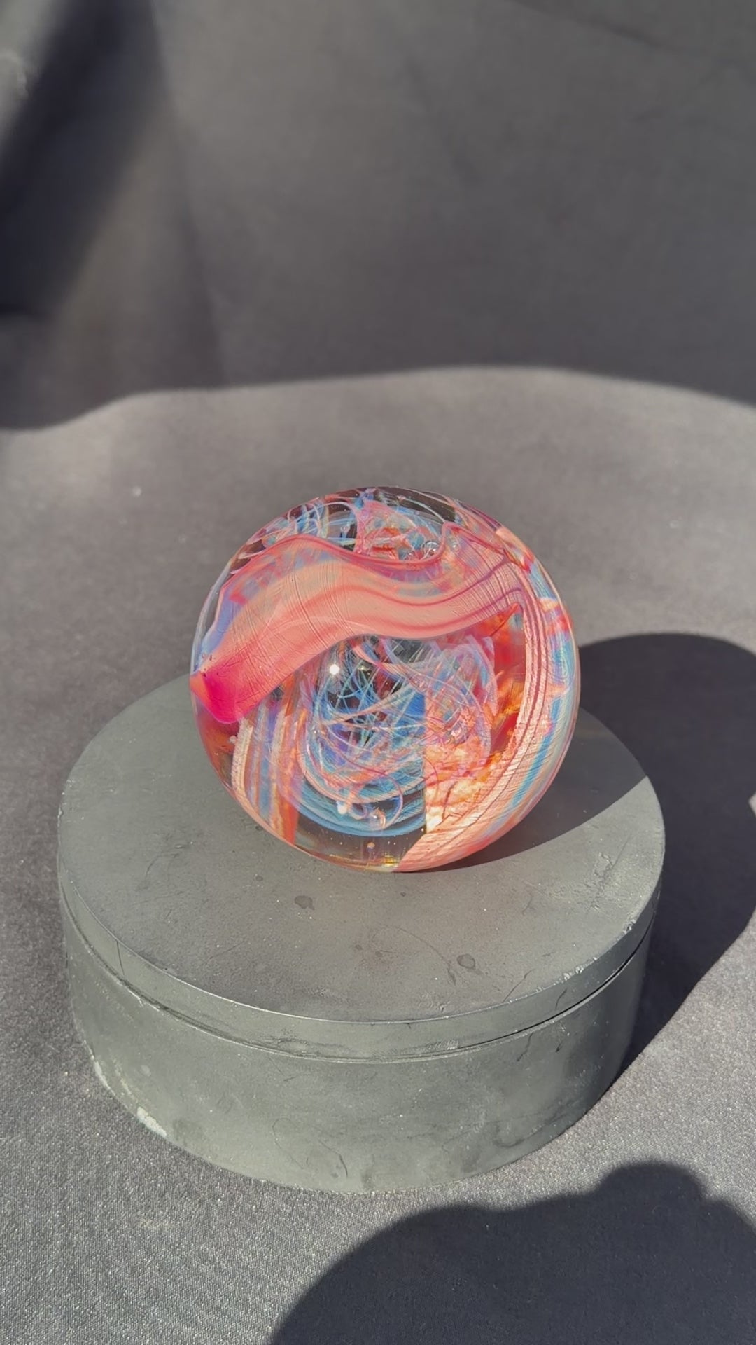 A very colorful and vibrant glass paperweight measuring at about 2.8" in diameter.