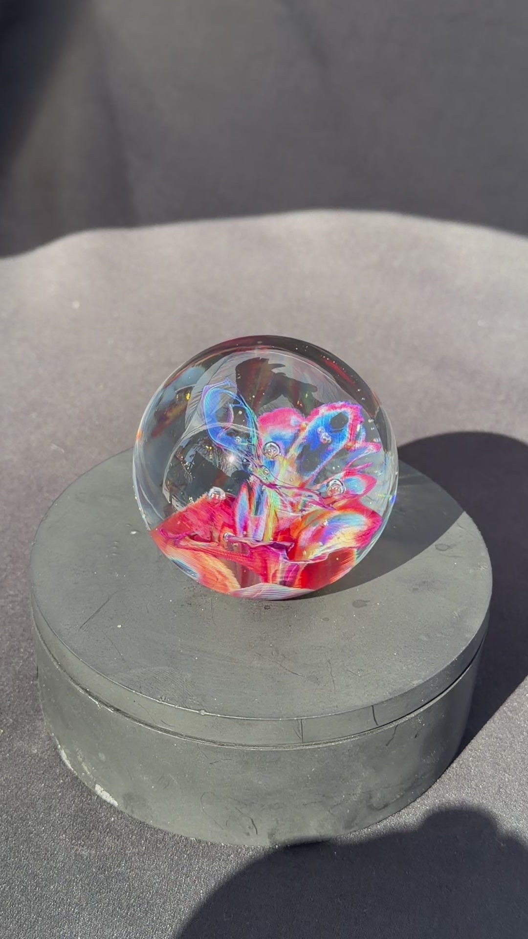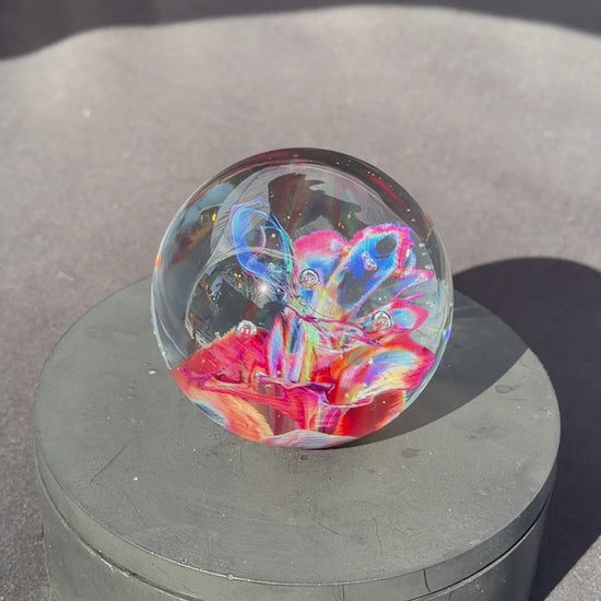 A very colorful and vibrant glass paperweight measuring at about 2.6" in diameter. The pattern within is created by blowing out a very thin bubble of color then letting heat and surface tension collapse it down back into a solid mass.