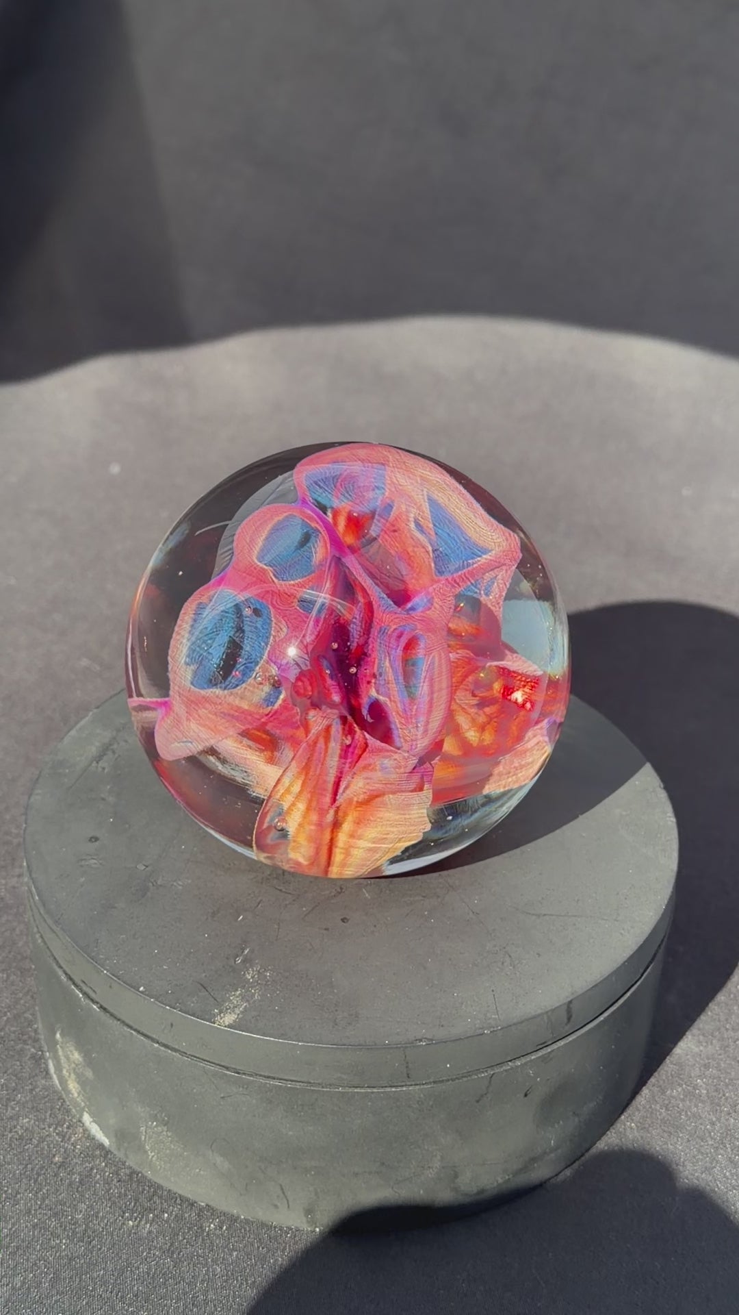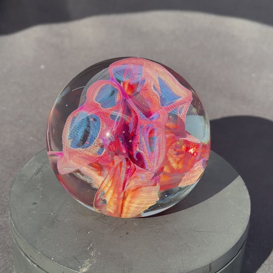 A very colorful and vibrant glass paperweight measuring at about 3.1" in diameter. The pattern within is created by blowing out a very thin bubble of color then letting heat and surface tension collapse it down back into a solid mass.