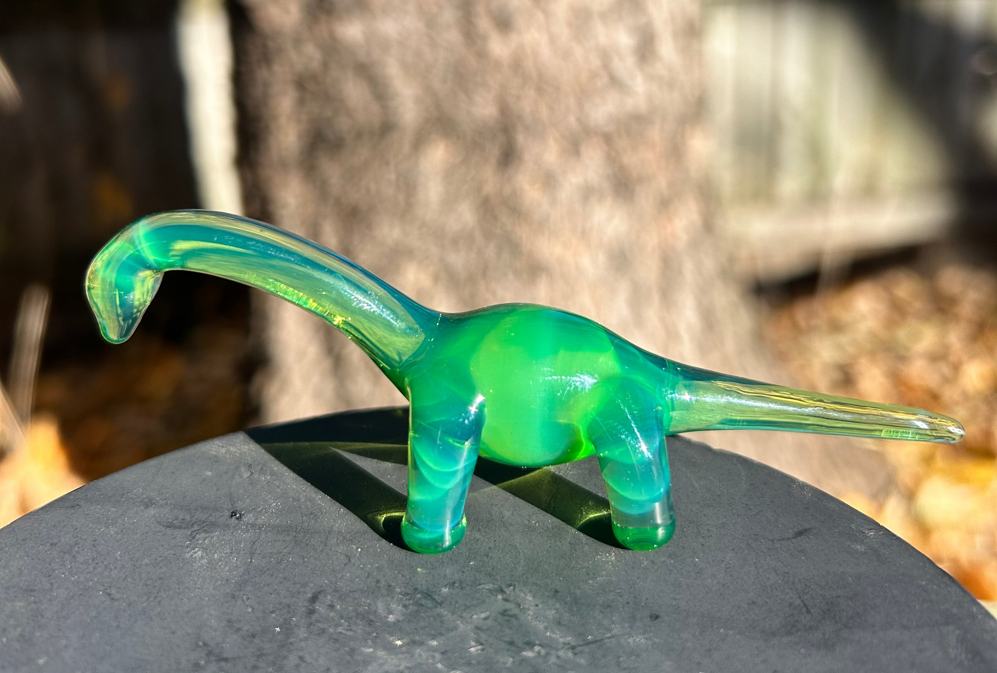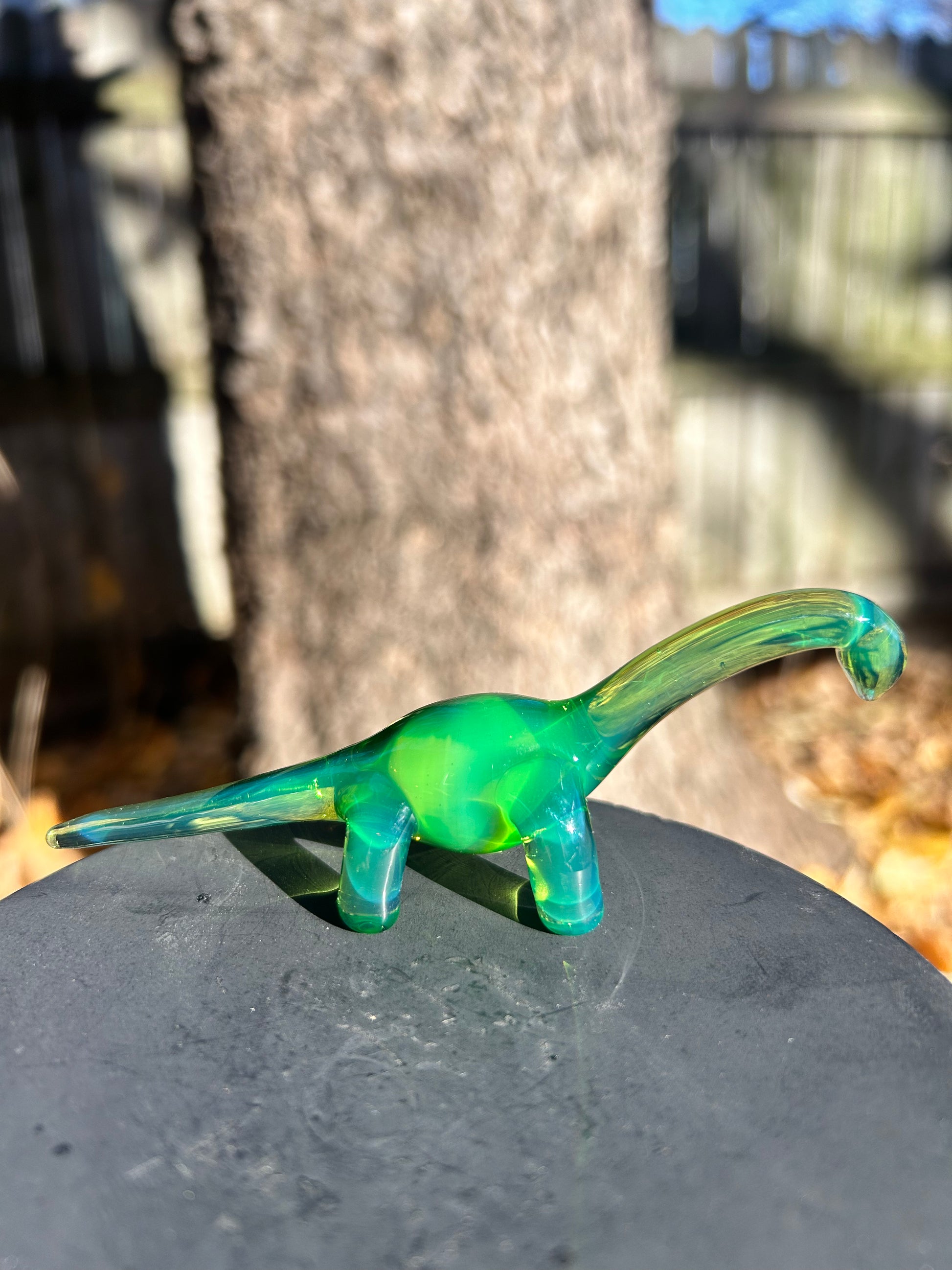 A handmade borosilicate glass dino sculpture. Its about 4 inches long and 2 inches tall.