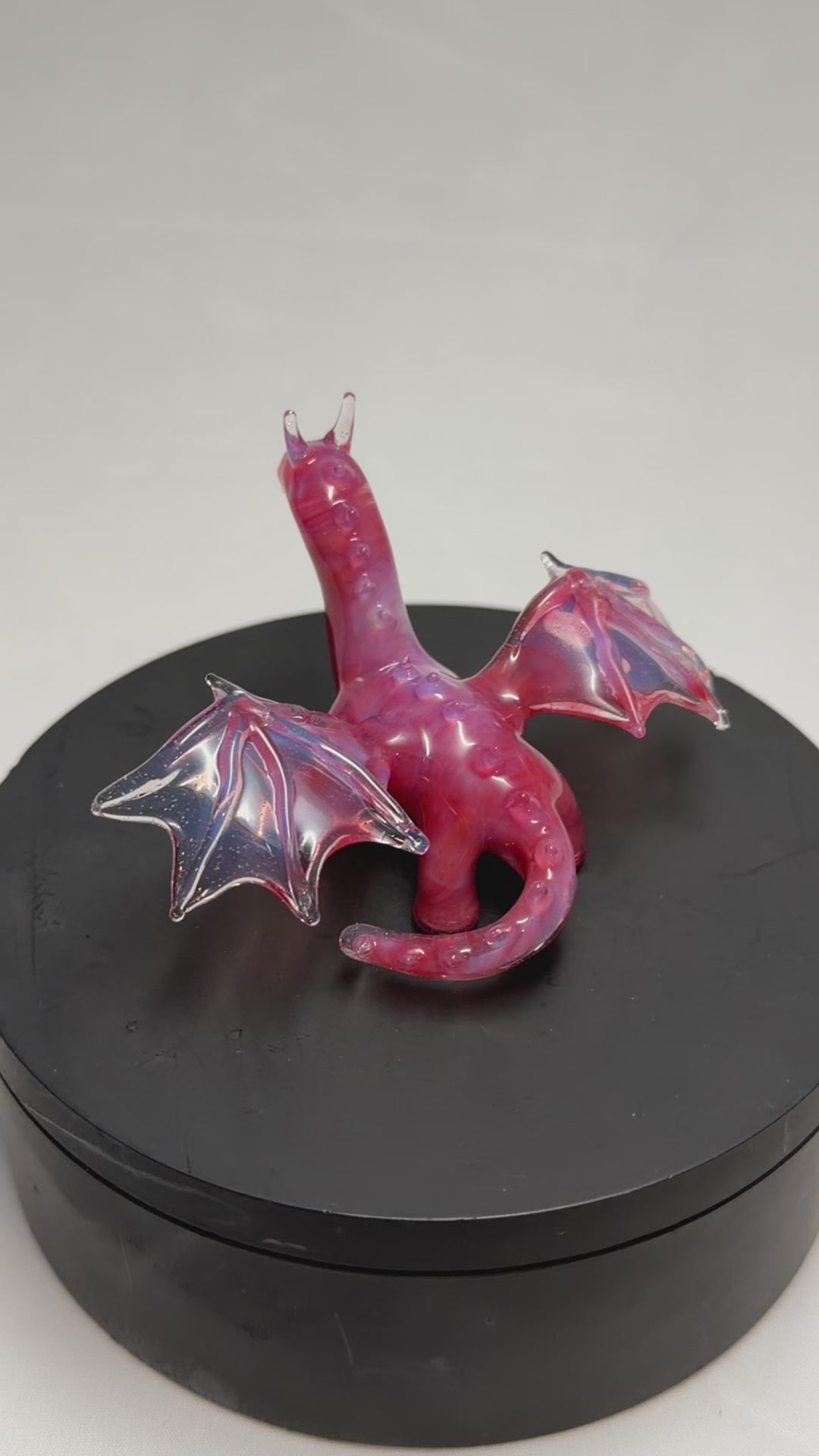 A dragon sculpture made using a pink/red opaline glass. About 3" long, 4" wide, and 2" tall.