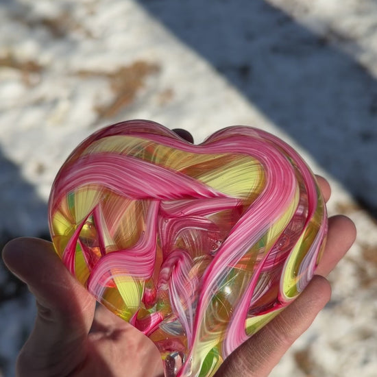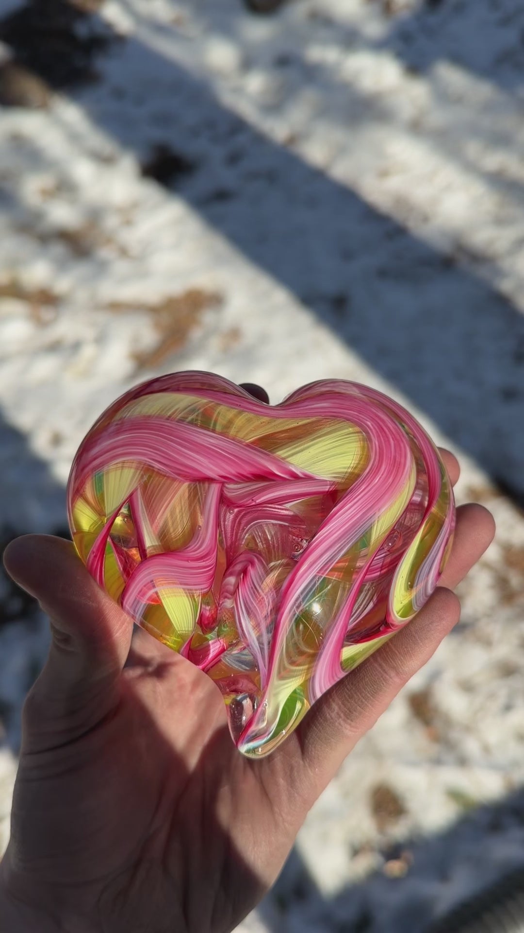 A color glass heart made with uranium glass and a beautiful swirling design. About 3.5”-4” wide and weights about 1.5-2lbs. Each pattern is different and unique due to the chaotic nature of how I make them.