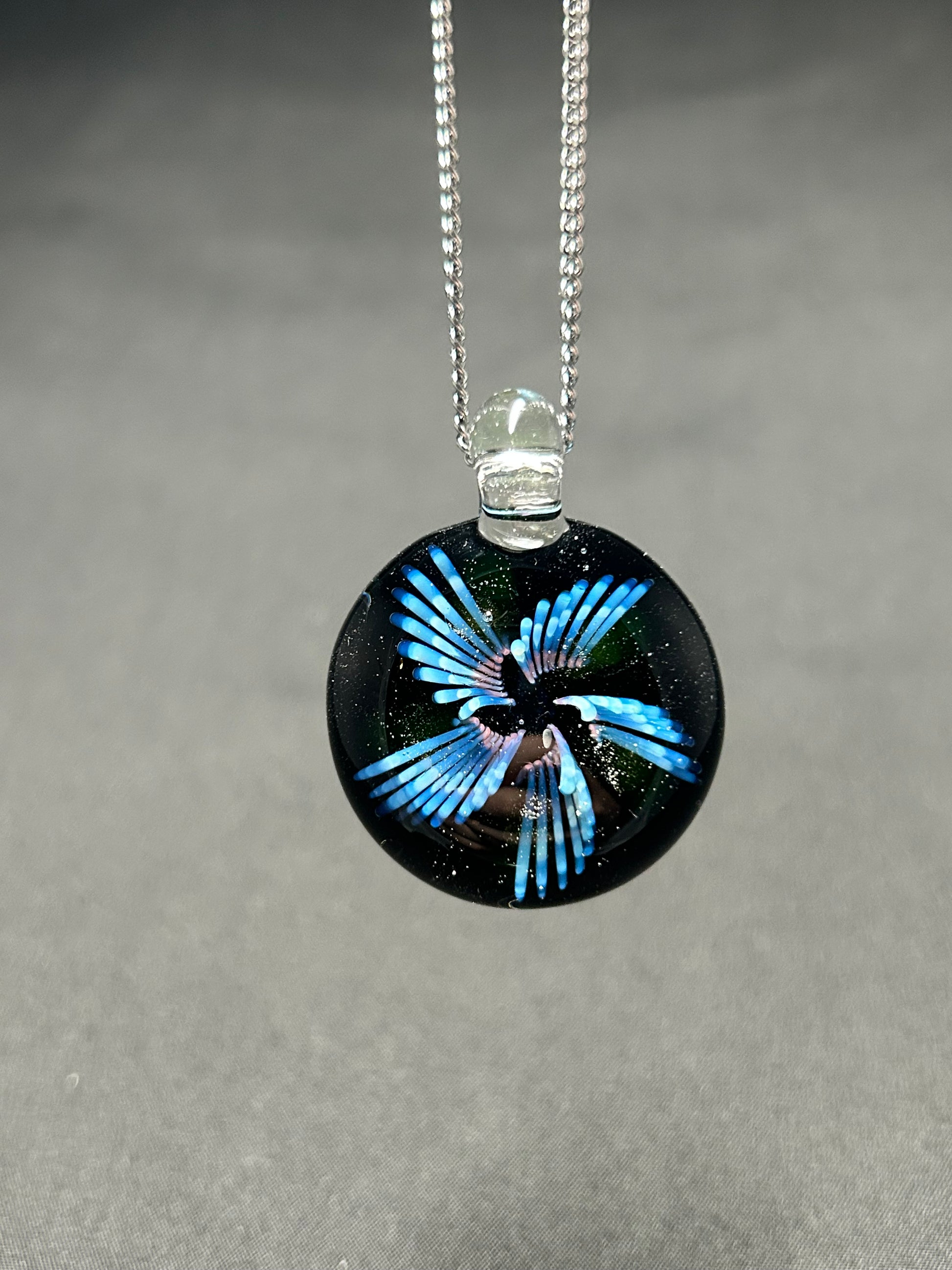 This pendant contains 6 Different colors of fluorescent glass (Red, Orange, Yellow, Green, Blue, and Purple). These glasses fluoresce due to the different ratios of uranium and europium in the glass. The bale for the pendant also contains the whole rainbow too. something new I've been messing with. Comes with a 20" stainless steel chain.
