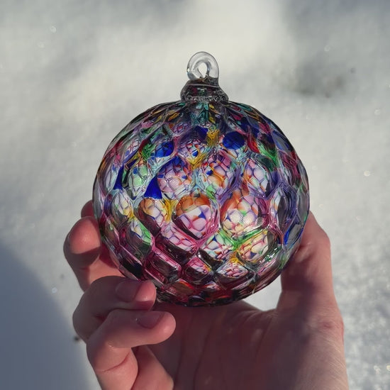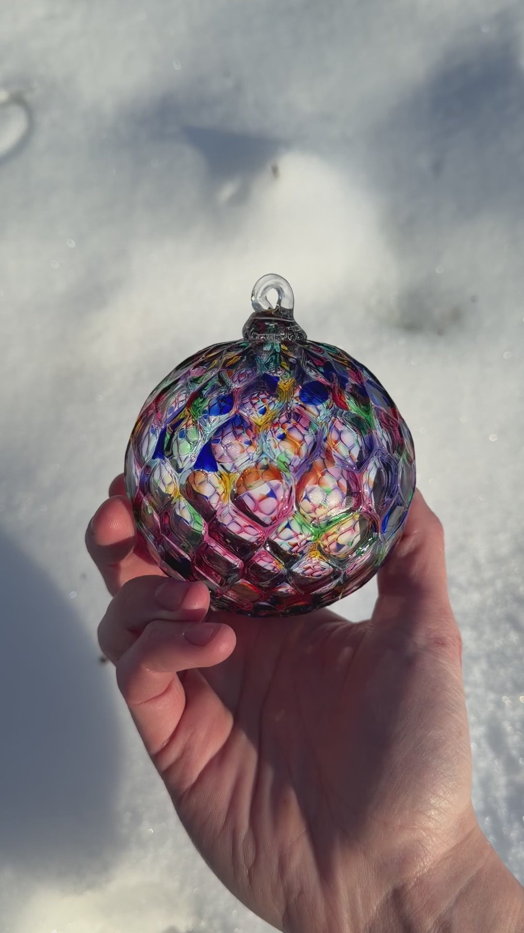 A colorful ornament that uses 7 different colors of transparent glass. I use a bit more pink, blue, and purple in my mix to really make it stand out from any other rainbow color mix out there. About 3.5" in diameter.