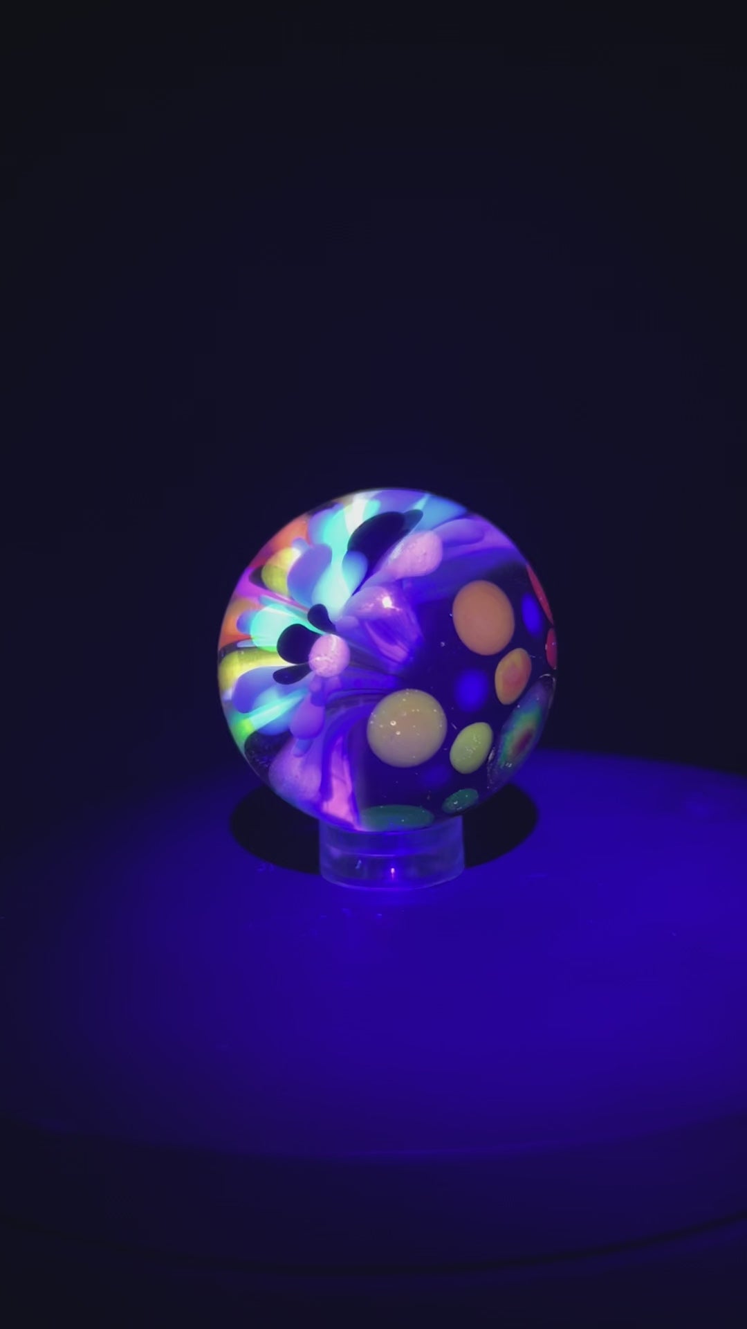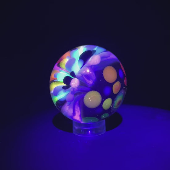 This Full Rainbow UV Implosion Marble features 6 UV colors that come alive under UV light. The back reveals even more UV dots and a small rainbow bullseye. Measuring 37mm, it’s a standout piece for anyone who loves unique, colorful glass art. Glows best under a 395nm UV light. Comes with an acrylic marble stand.