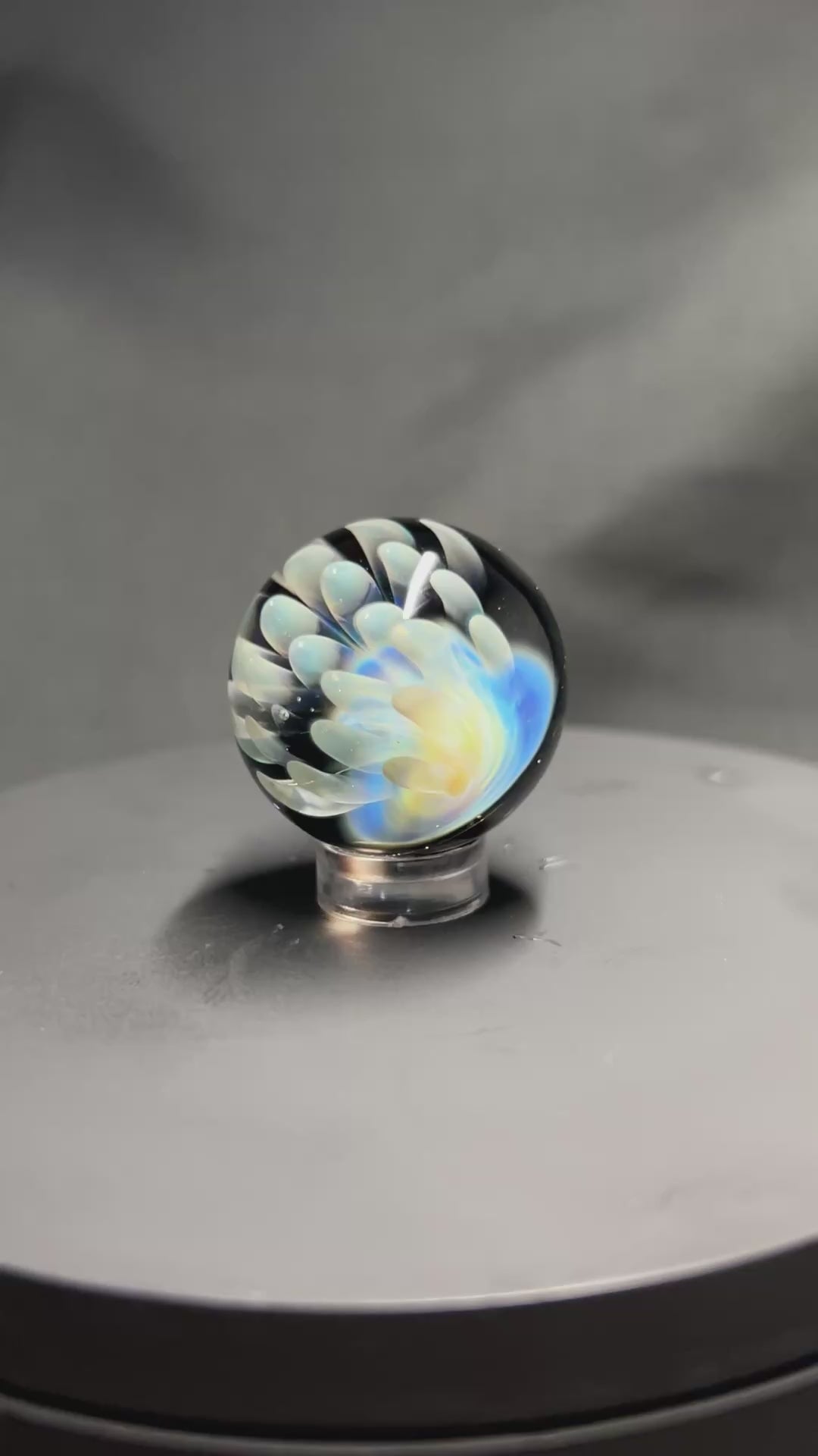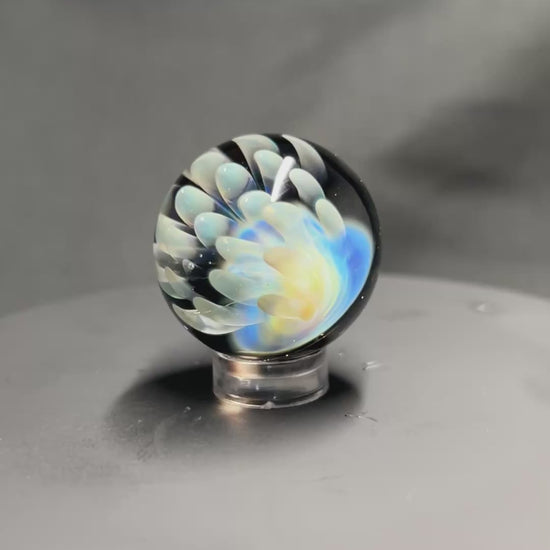Silver fumed implosion marble with UV pink/red tendrils. This is my first successful fume attempt and has a fantastic range of colors. Also glows under UV light for an added layer of depth. Best appreciated in bright light. Its about 31mm in diameter and comes with a acrylic marble stand.