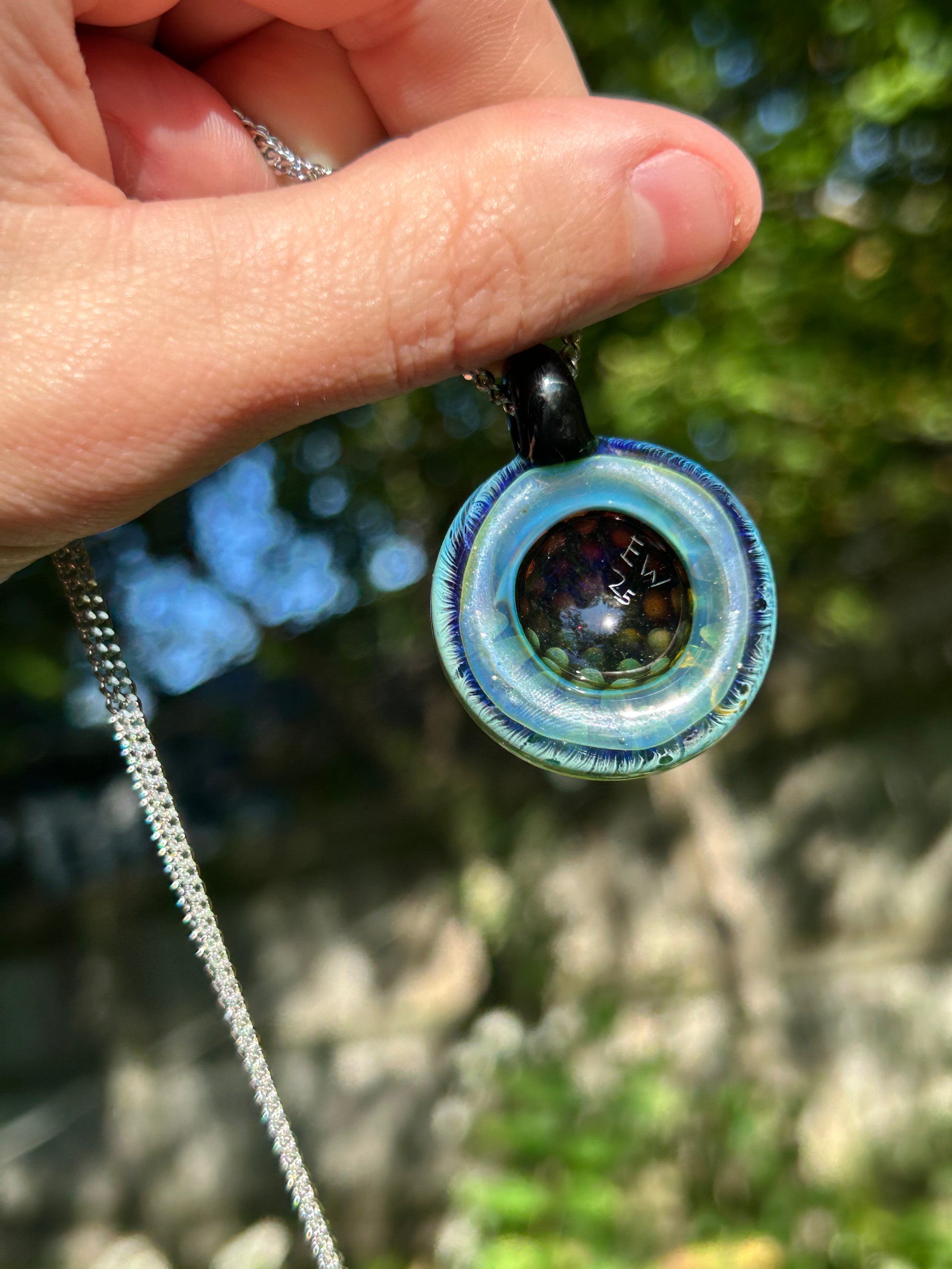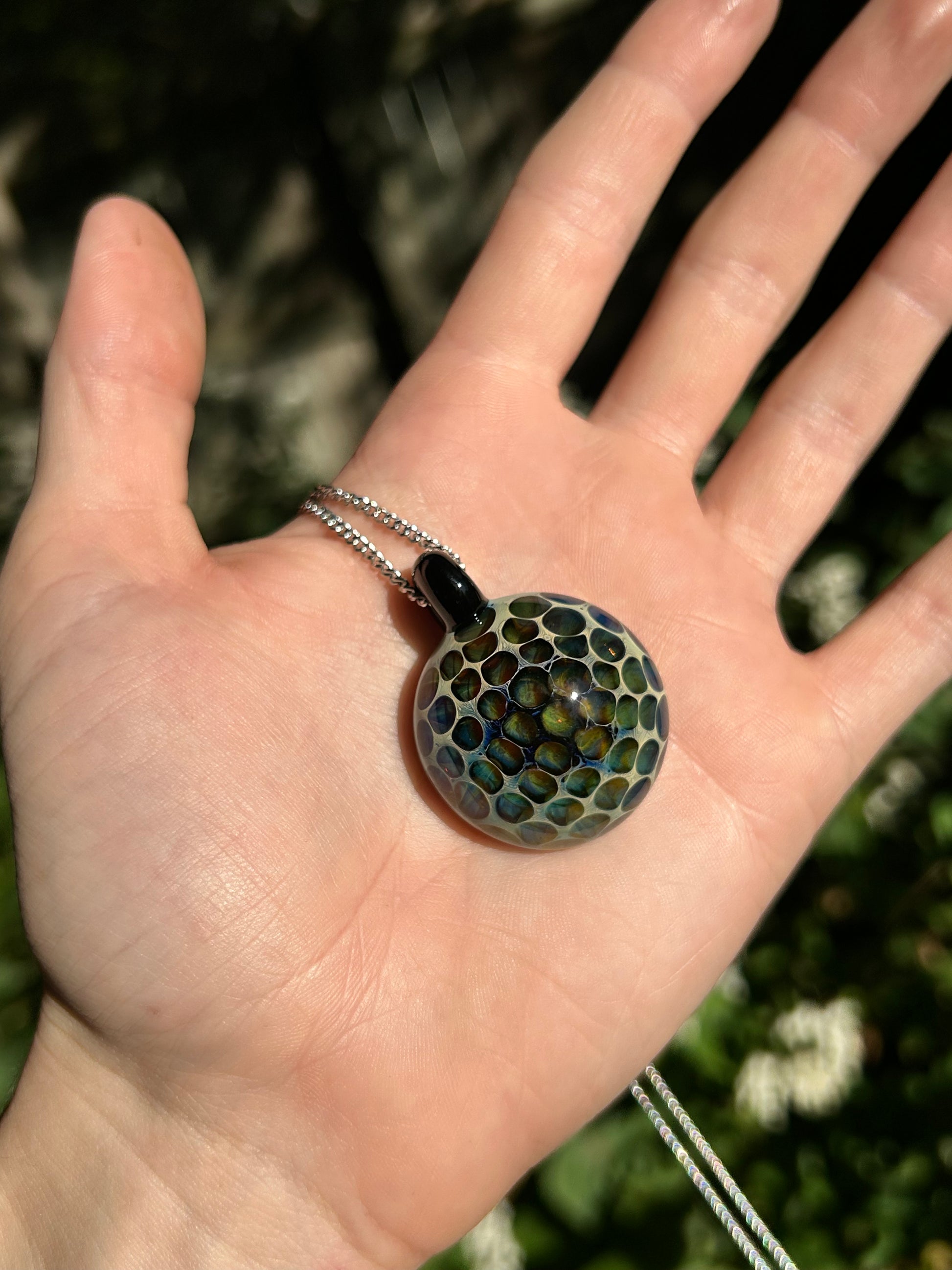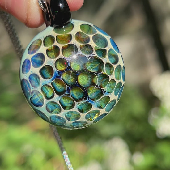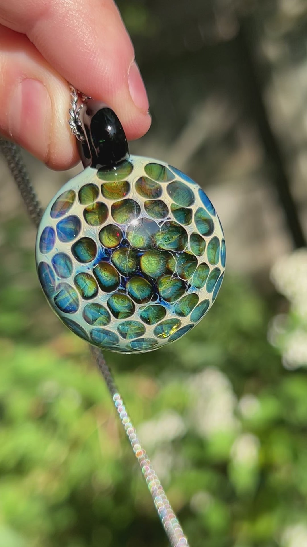 Uses a silver green color that ranges from beige to blue to green depending on how it was worked. This one has a beautiful range colors hidden deep within each dot. Glows green under UV light. Glows best under 395nm UV light. Comes on a 20" stainless steel chain.