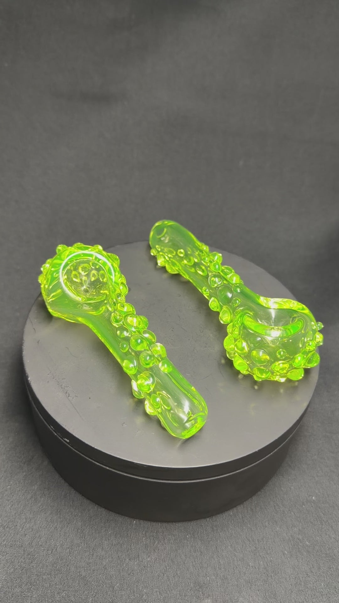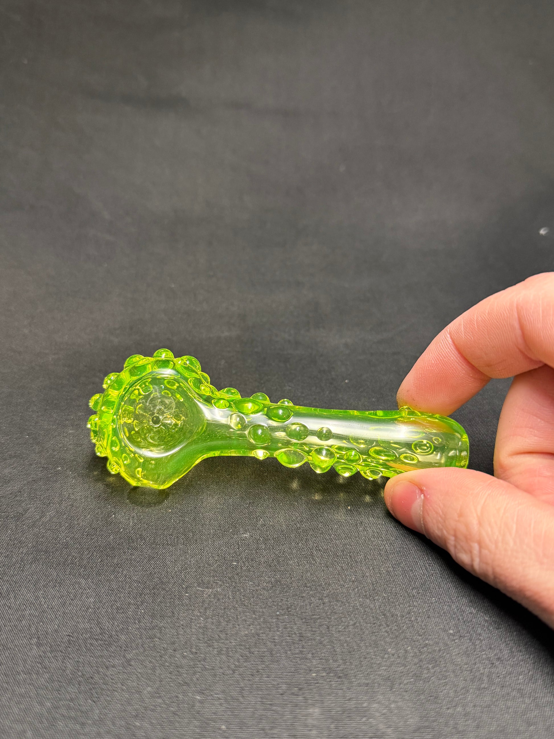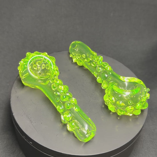 Small portable sized uranium glass pipe. Been making more small pipes recently and have fallen in love with them. Even though its small it still holds a pretty decent amount. Each one has a nice texture that flows from top to bottom which is also uranium glass too. They are a little over 3.5" in length. Made from modern day borosilicate glass.