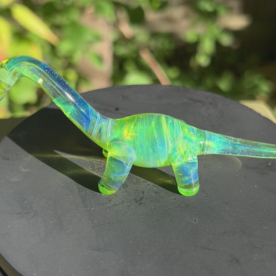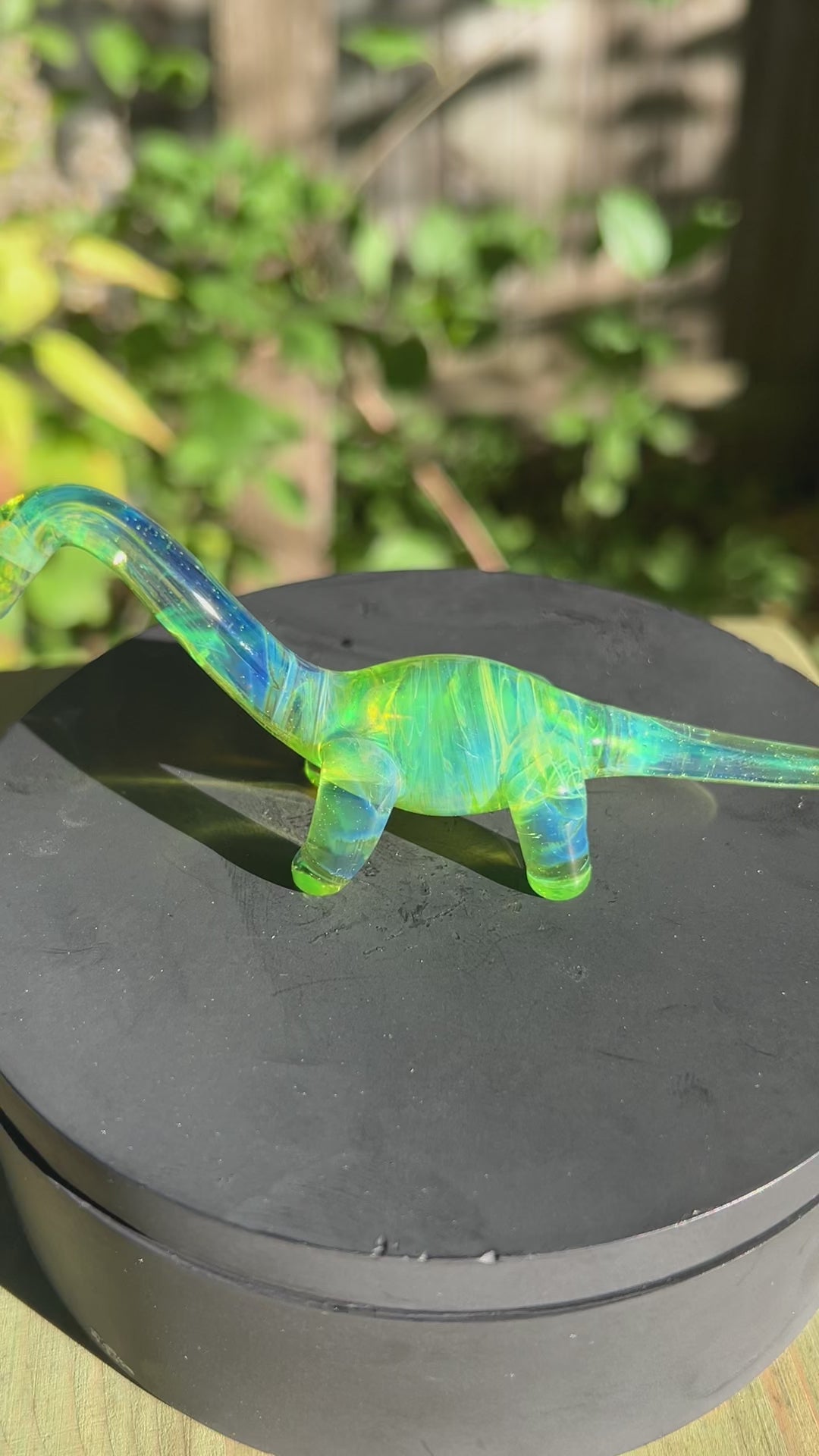 A handmade borosilicate glass dino sculpture. Its about 4 inches long and 2 inches tall.