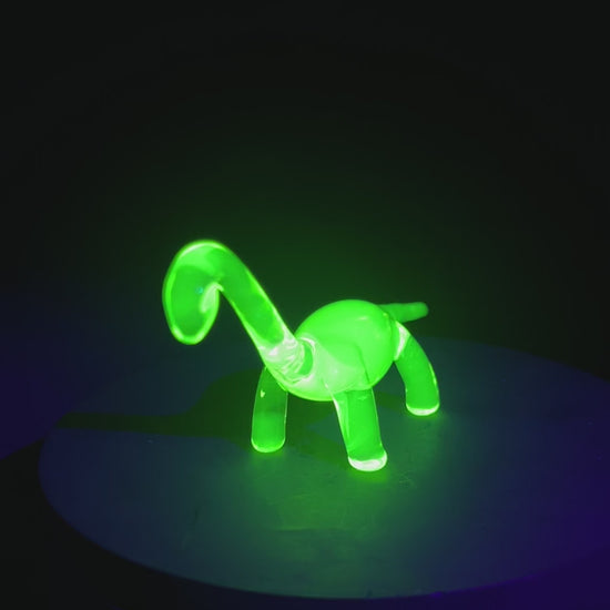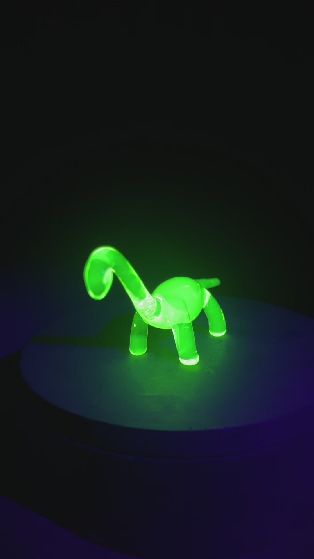 A handmade borosilicate glass dino sculpture made from modern day uranium glass. Both options glow great under UV light. The Intense green dino glows brighter than the Light Green dino. They are about 4-4.5 inches long and 2 inches tall.