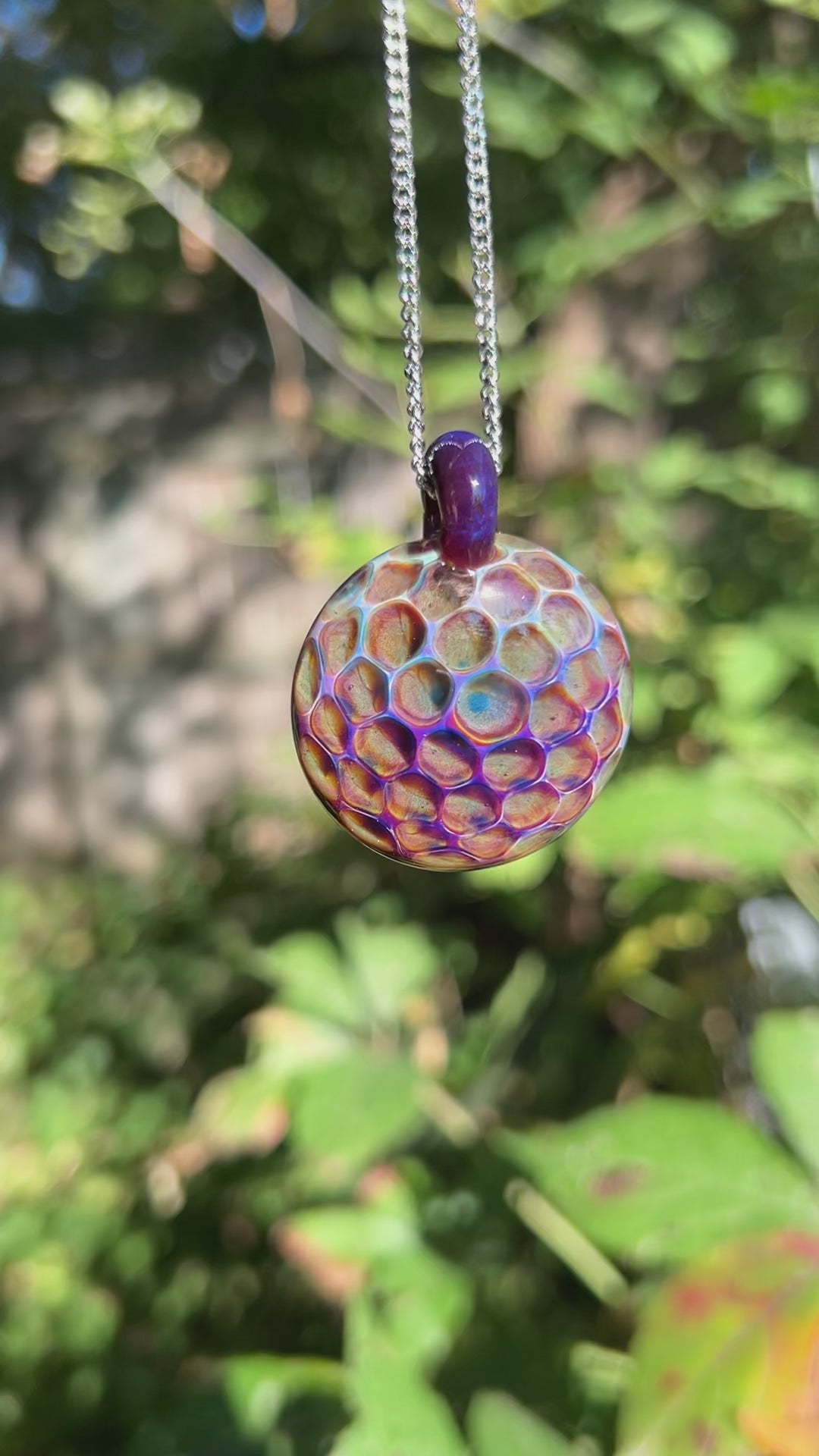Comes on a 20" stainless steel chain. Looks best under bright sunlight