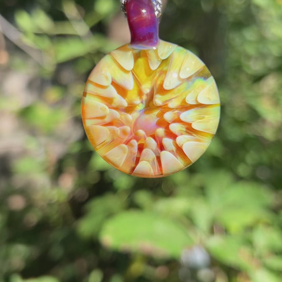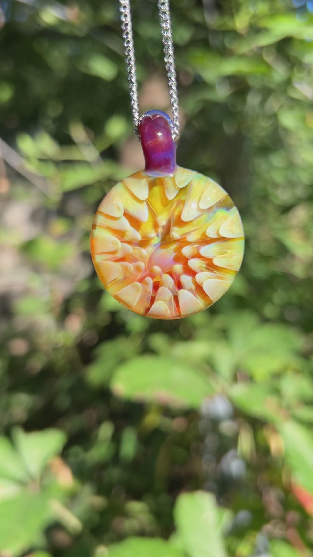 Comes on a 20" stainless steel chain. Looks best under bright sunlight
