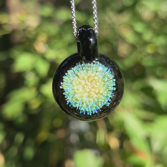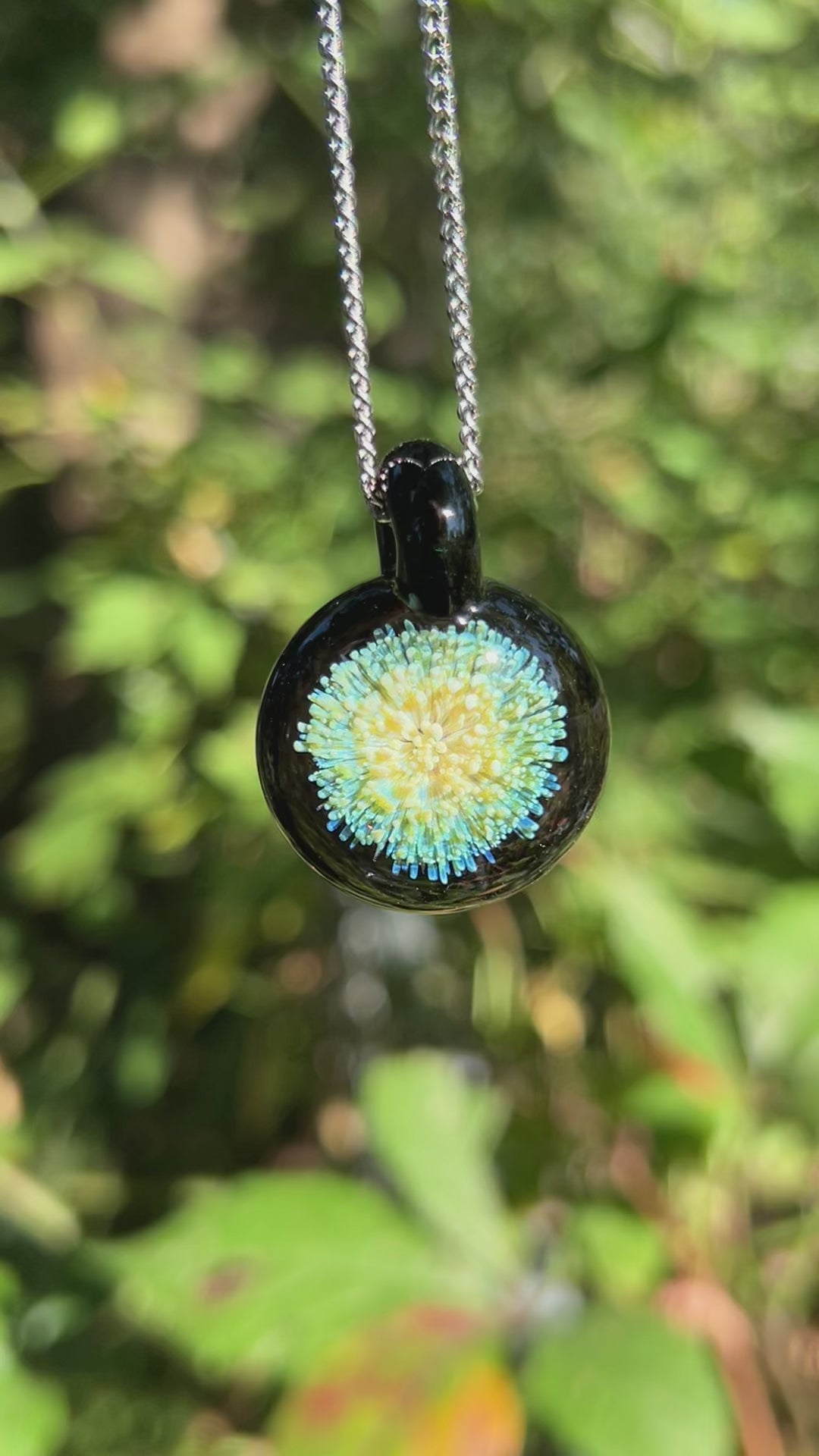 Comes on a 20" stainless steel chain. Looks best under bright sunlight