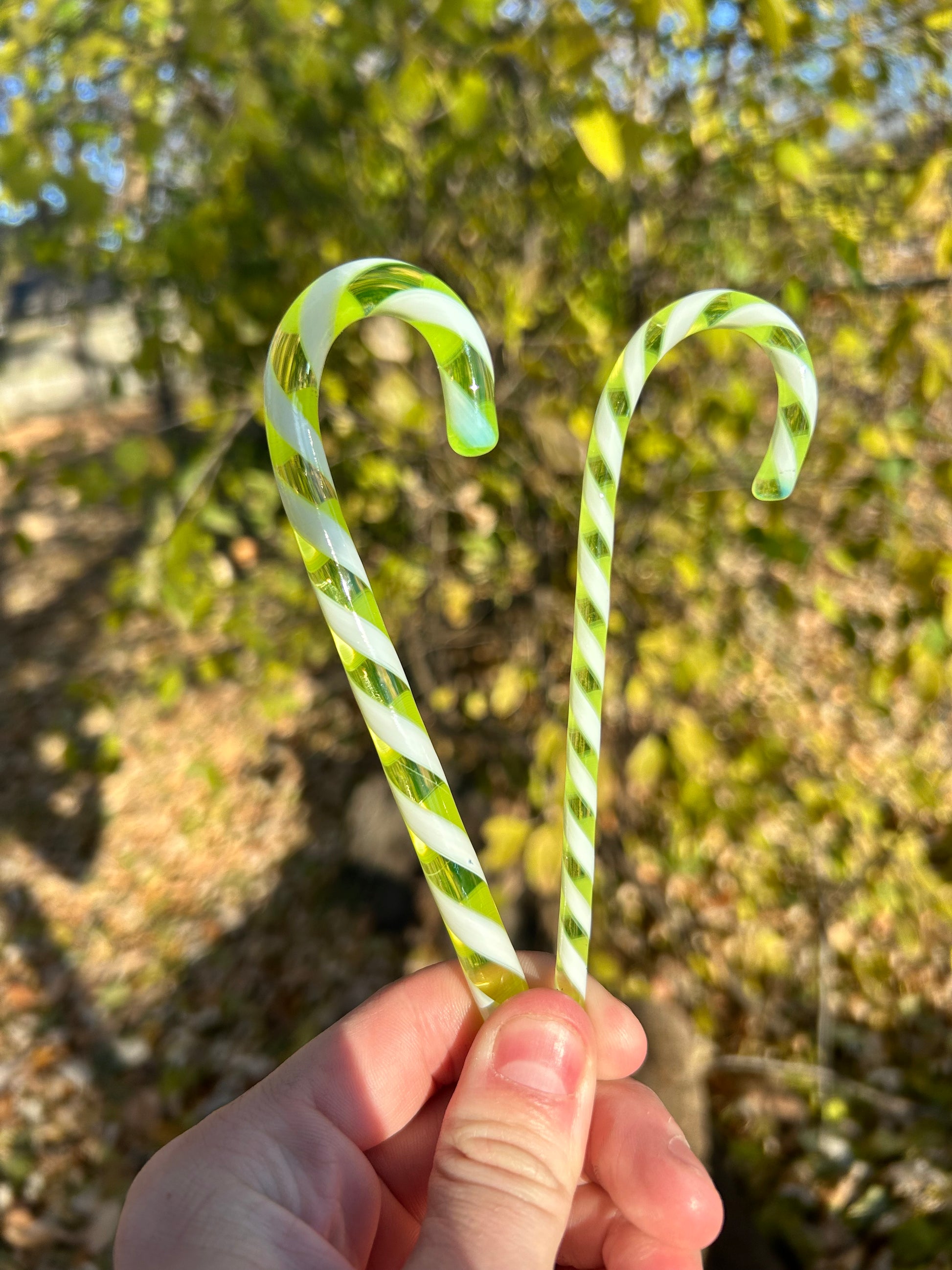 Some glass candy canes made from modern day uranium glass with a bit of white glass for the stripes. I've got 2 main sizes normal and skinny. The normal ones are a bit thicker than your typical edible candy cane but around the same size. The skinny ones are a bit smaller and skinnier than your typical candy cane. Do expect a reasonable amount of variation in thickness and size as they are each handmade.