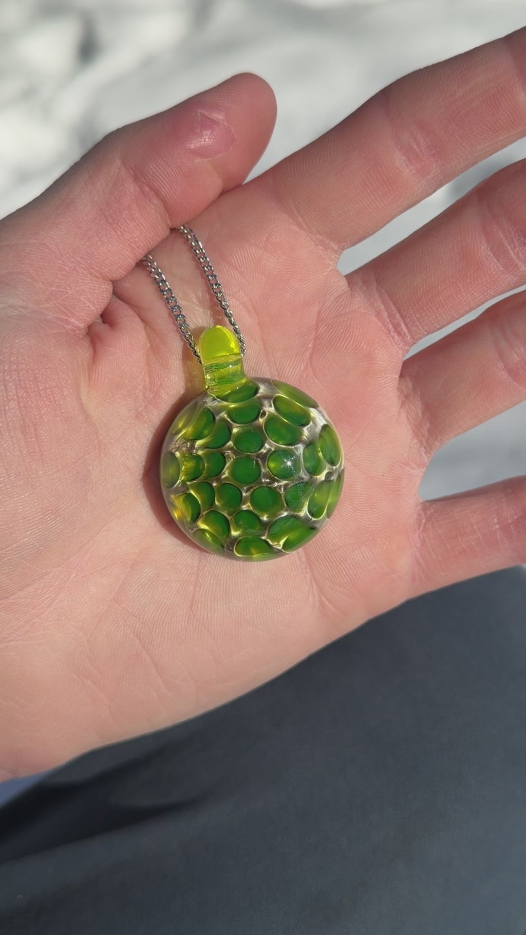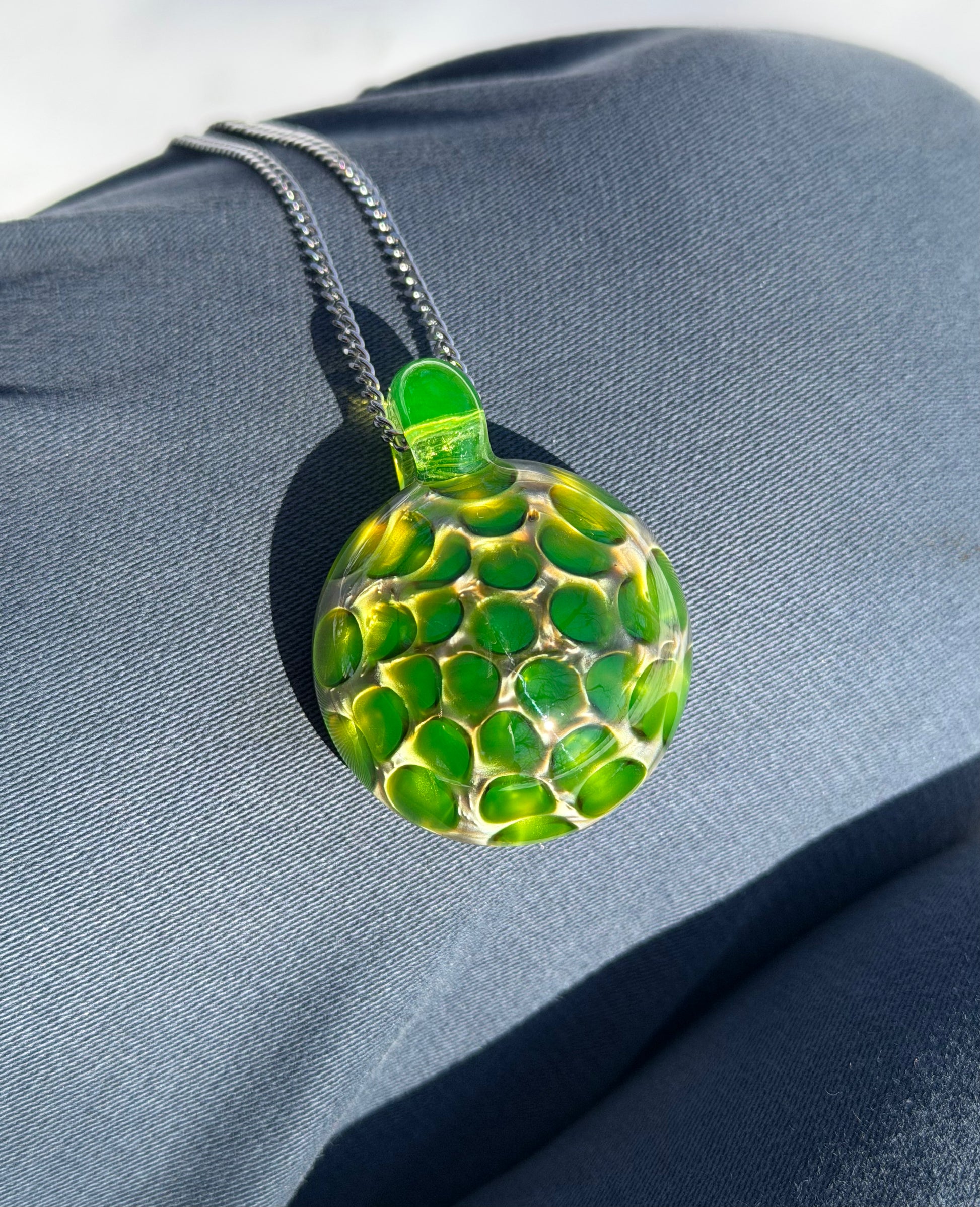 This uranium glass pendant with a honeycomb pattern has a metallic-looking backing that makes it shimmer in the sunlight.