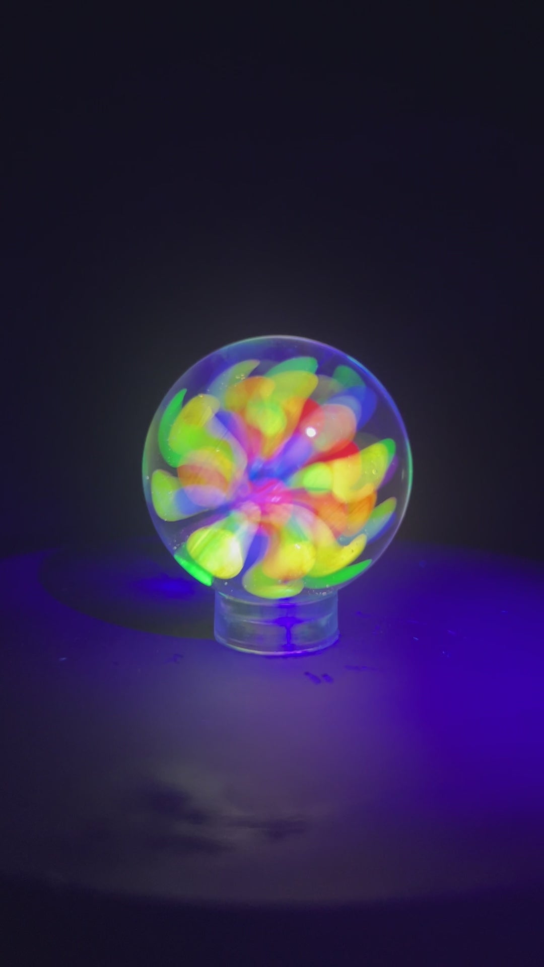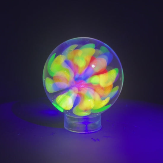 This marble contains 6 Different colors of fluorescent glass (Red, Orange, Yellow, Green, Blue, and Purple). These glasses fluoresce due to the different ratios of uranium and europium in the glass. This one was my first marble I tried making out of the rainbow glass. Its has a lot of different looks depending on the angle you view it from. Its about 34mm in diameter and comes with an acrylic marble stand.